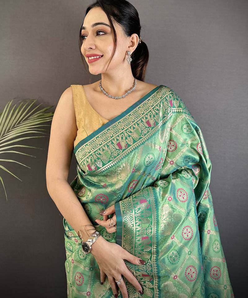 | Product Description | Step Into Elegance With Elora Fashion’s Aqua Green Soft Silk Geometric Zari Woven Patola Saree, A Perfect Mix Of Tradition And Contemporary Charm. Crafted From Soft, Premium Silk, This Saree Features Intricate Geometric Patterns With Golden Zari, Giving It A Vibrant Yet Sophisticated Appeal. Ideal For Weddings, Festive Celebrations, Or Special Occasions, This Trending Women’s Ethnic Wear Ensures You Make A Statement With Effortless Style.