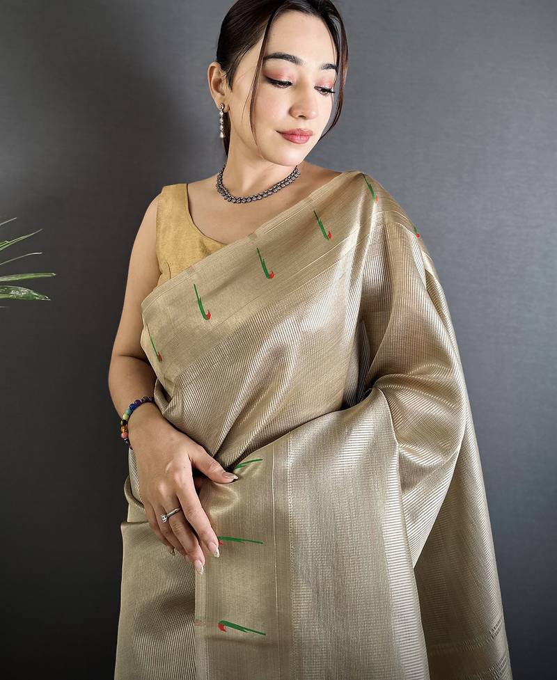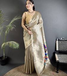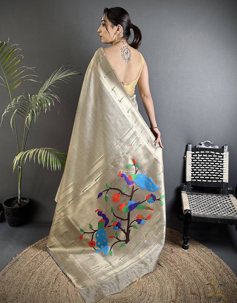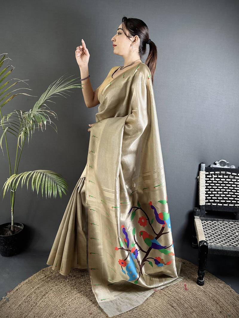 Beige tissue minakari plain zari weaving paithani saree