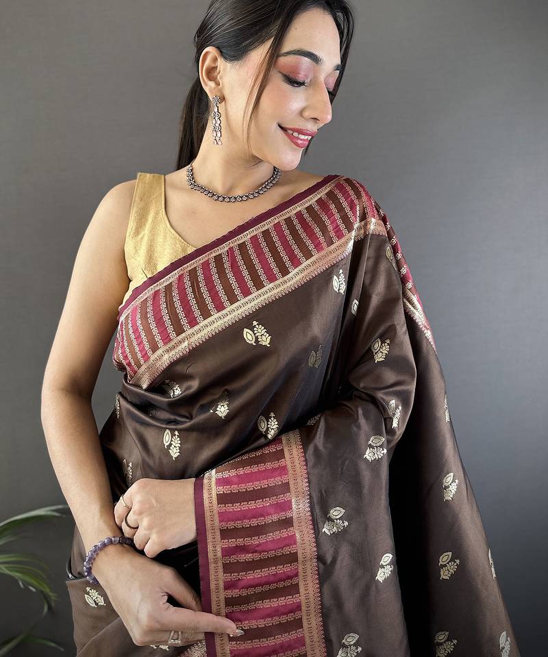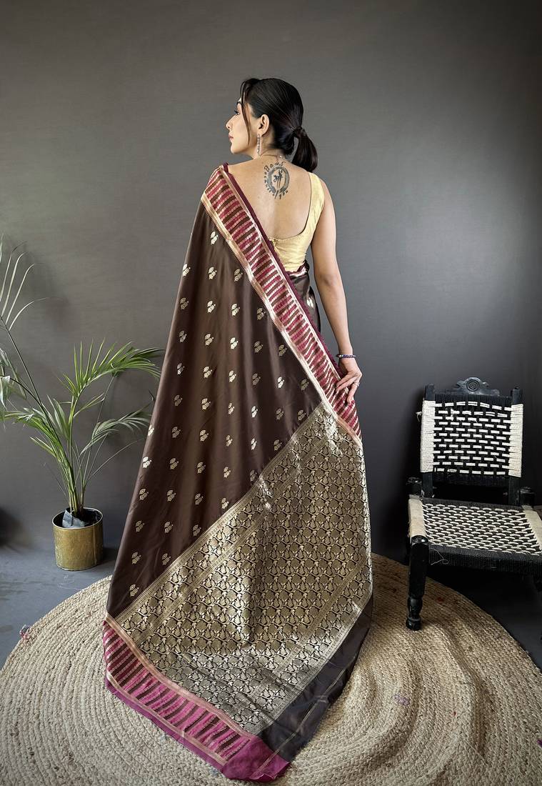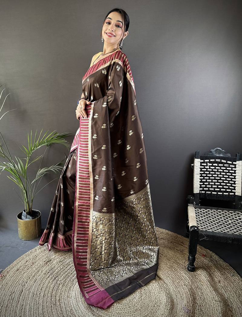 Brown lichi silk blend jacquard zari woven motifs banarasi saree