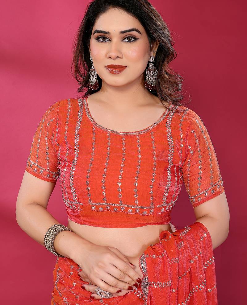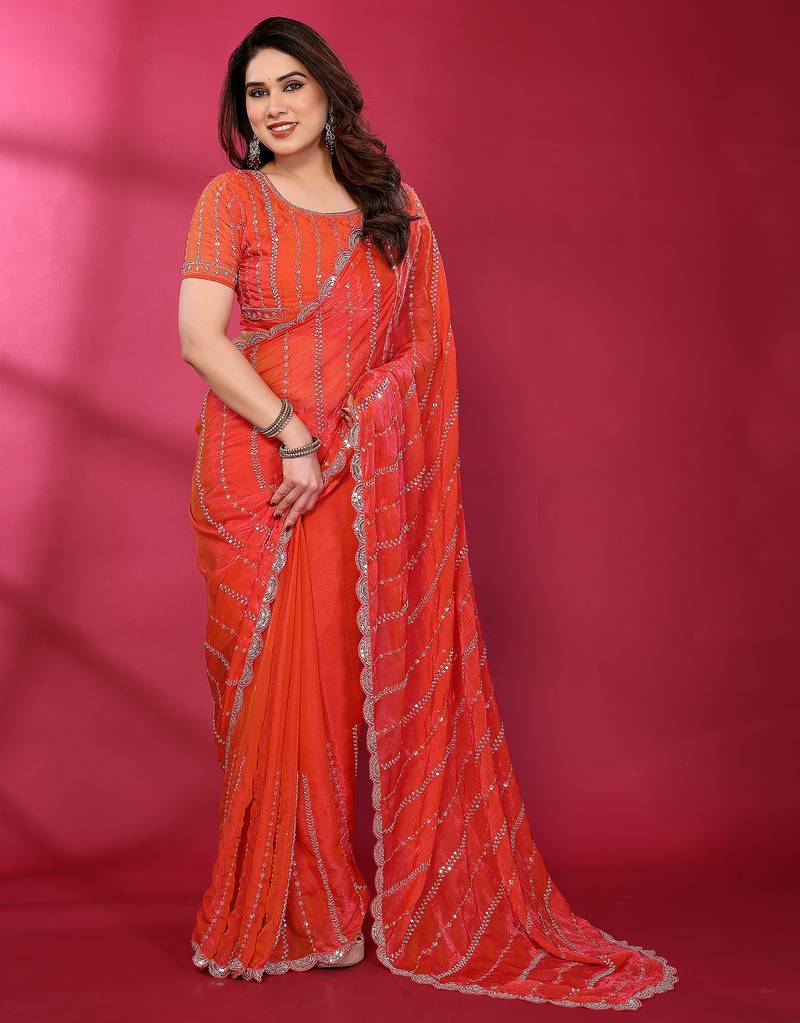 | Product Description | The Carrot Red Fendy Silk Saree Features A Bold Color With Lovely Beadwork. This Soft Silk Fabric Feels Smooth And Stays Light On Your Skin. It Is The Best Choice For Weddings, Festivals, And Parties. This Red Saree Brings A Famous Bollywood Style To Your Closet. The Linear Sequence Beads Shine Beautifully When You Move. It Is Very Easy To Wrap And Stays Comfortable For Many Hours Of Celebration. Get A High Quality Look That Is Affordable And Stylish. This Stunning Outfit Helps You Stand Out In Every Photo. Pair It With Simple Jewelry To Complete Your Perfect Traditional Indian Look Today. |