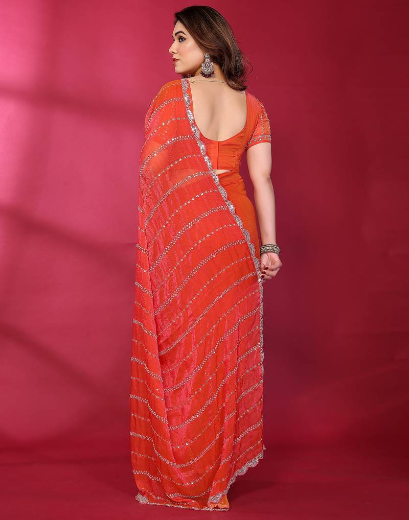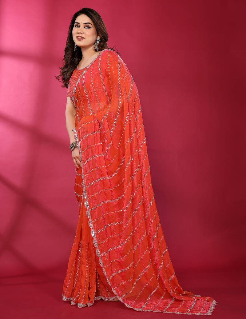 Carrot red fendy silk linear sequence beads work bollywood saree