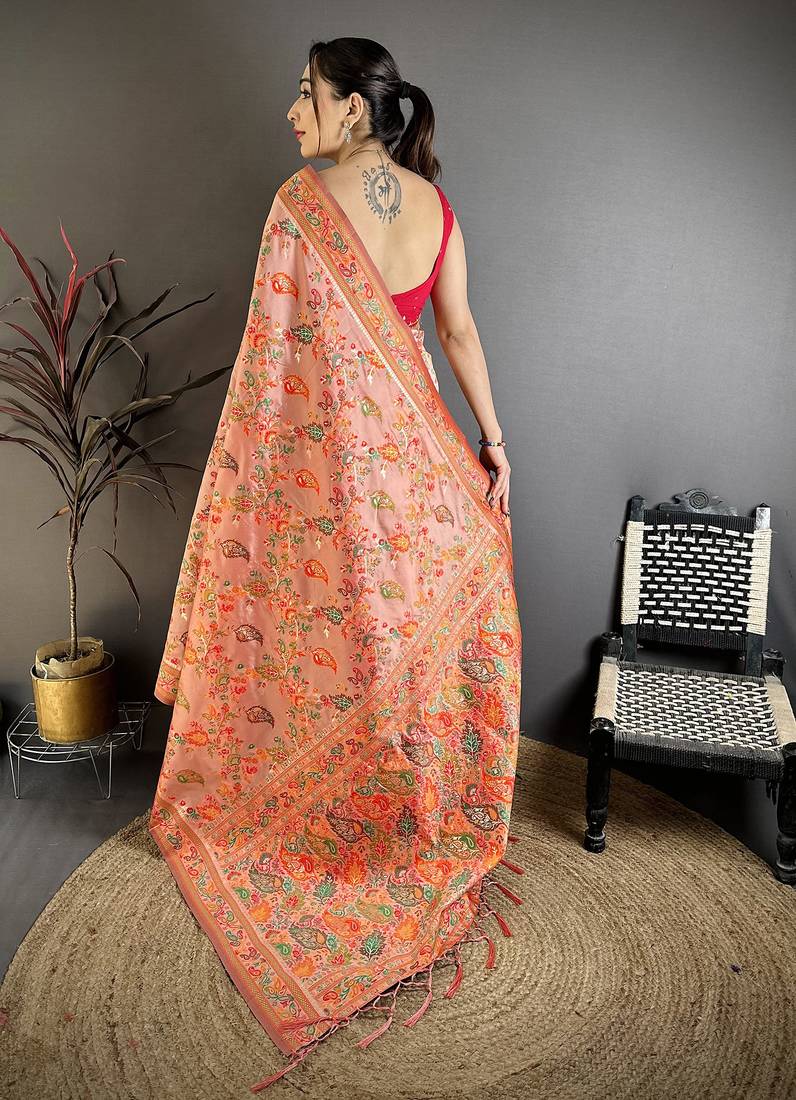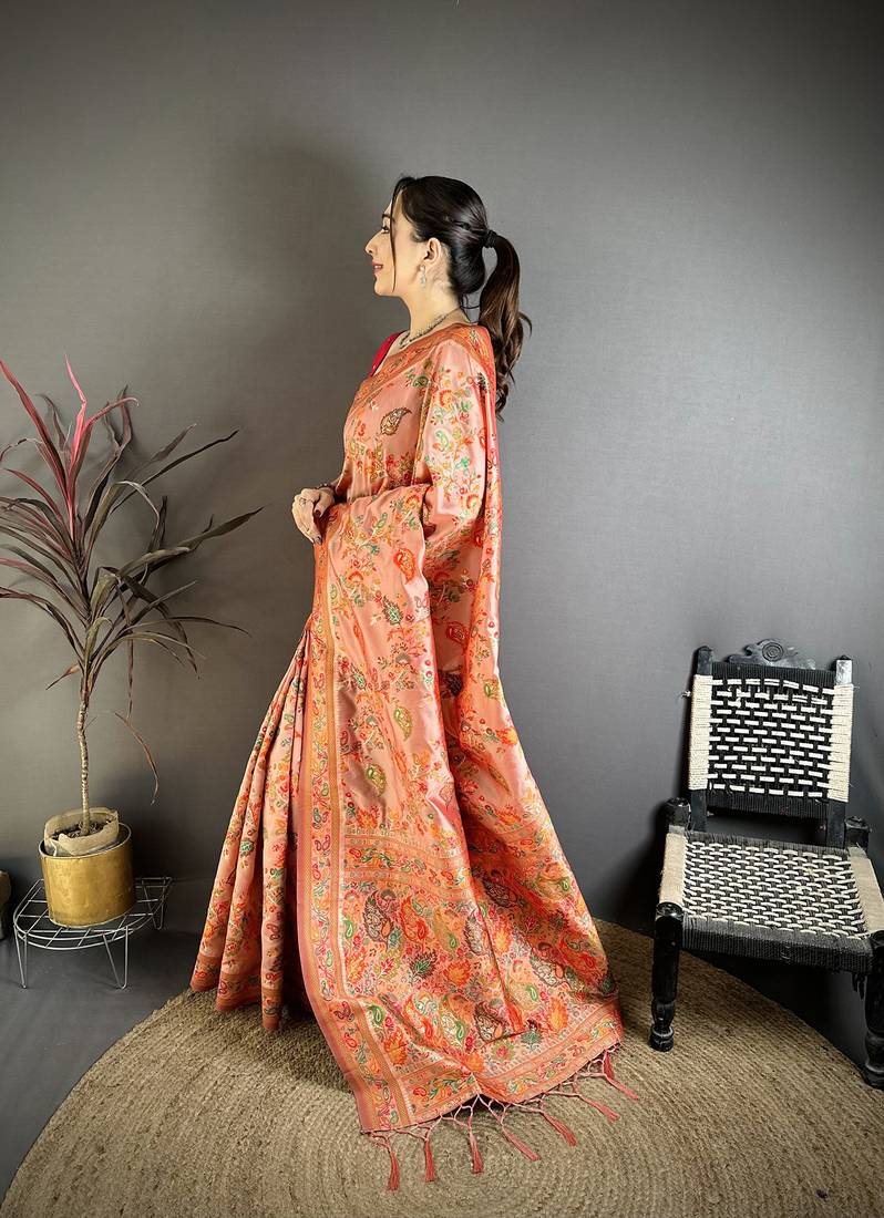 Coral pashmina silk floral&paisley patterns madhubani design kashmiri saree
