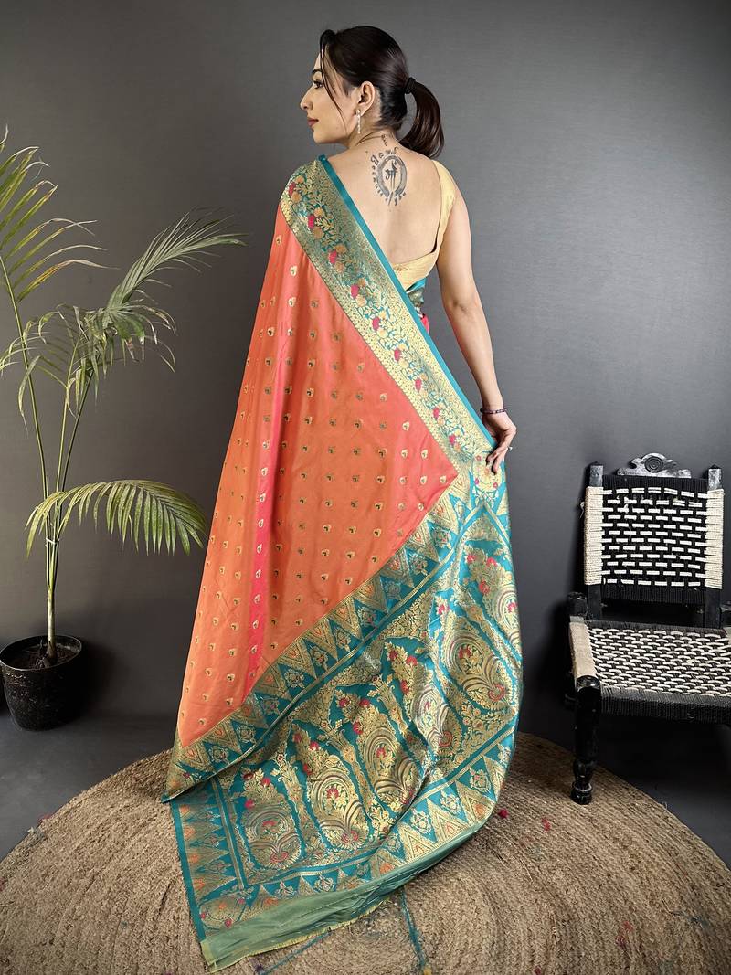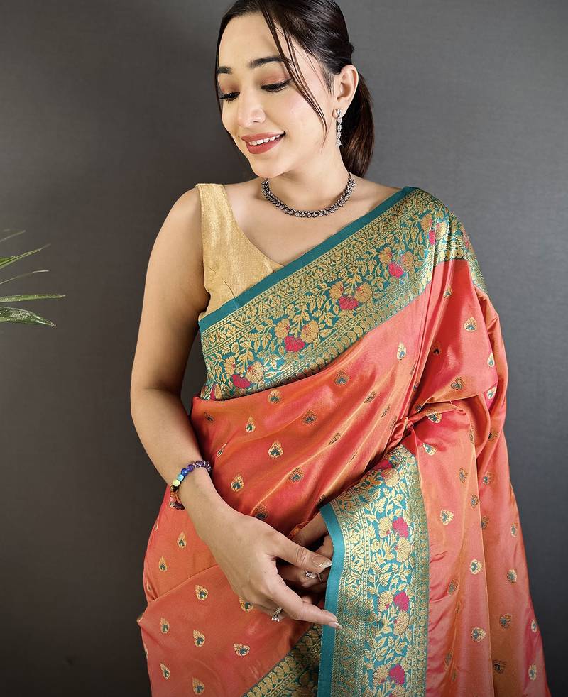 Coral pink soft silk blend intricate motifs zari weaving banarasi saree with contrast weaving border