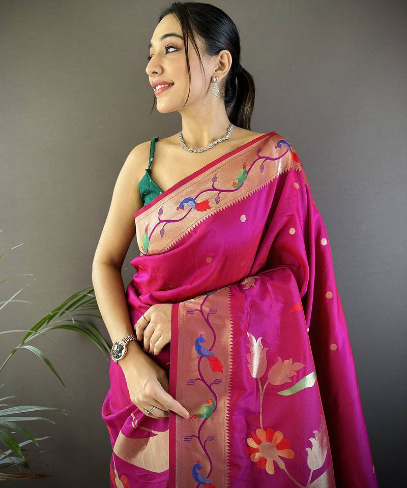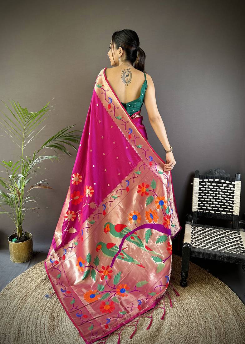 Dark pink soft silk blend zari woven floral motifs paithani saree