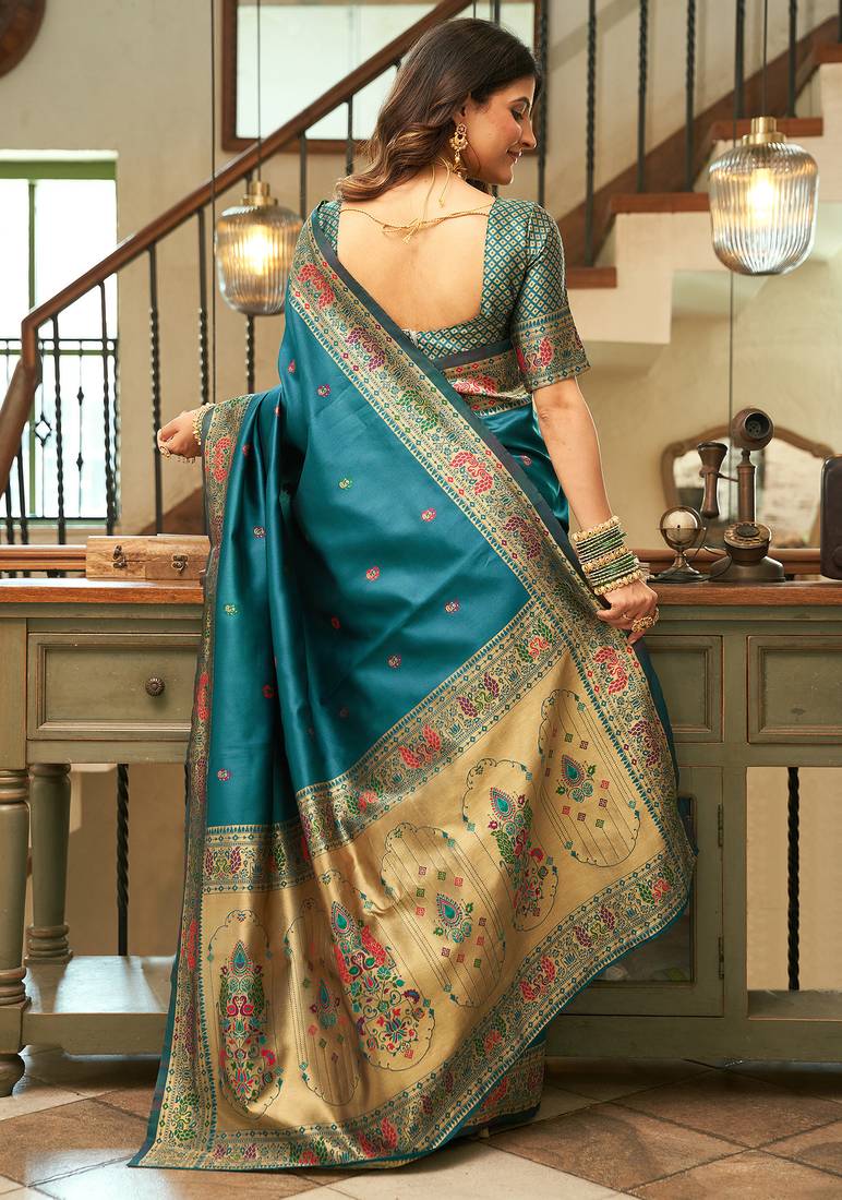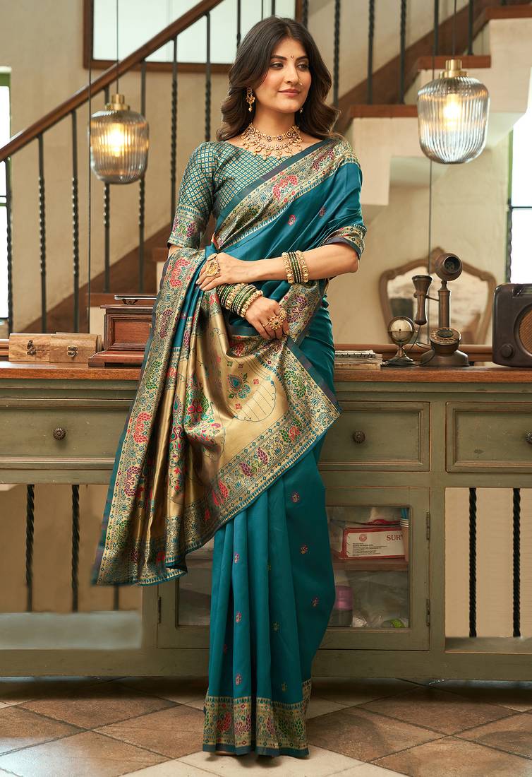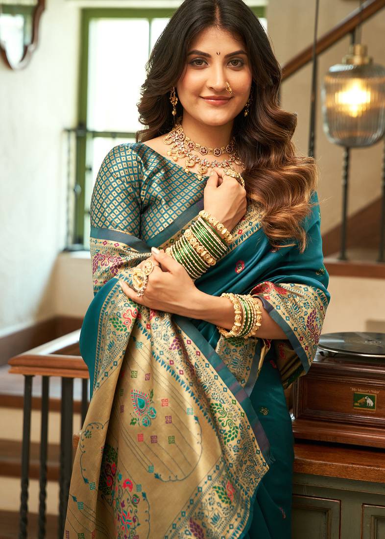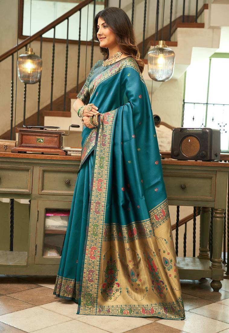 | Product Name | Dark Teal Silk Peacock Motifs Woven Work Paithani Saree | |