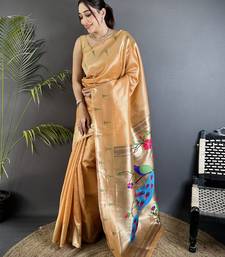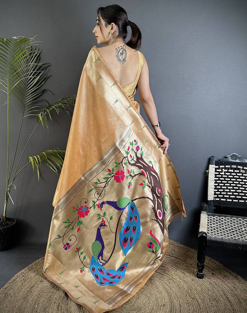Gold yellow tissue peacock & floral motifs mina zari weaving paithani saree
