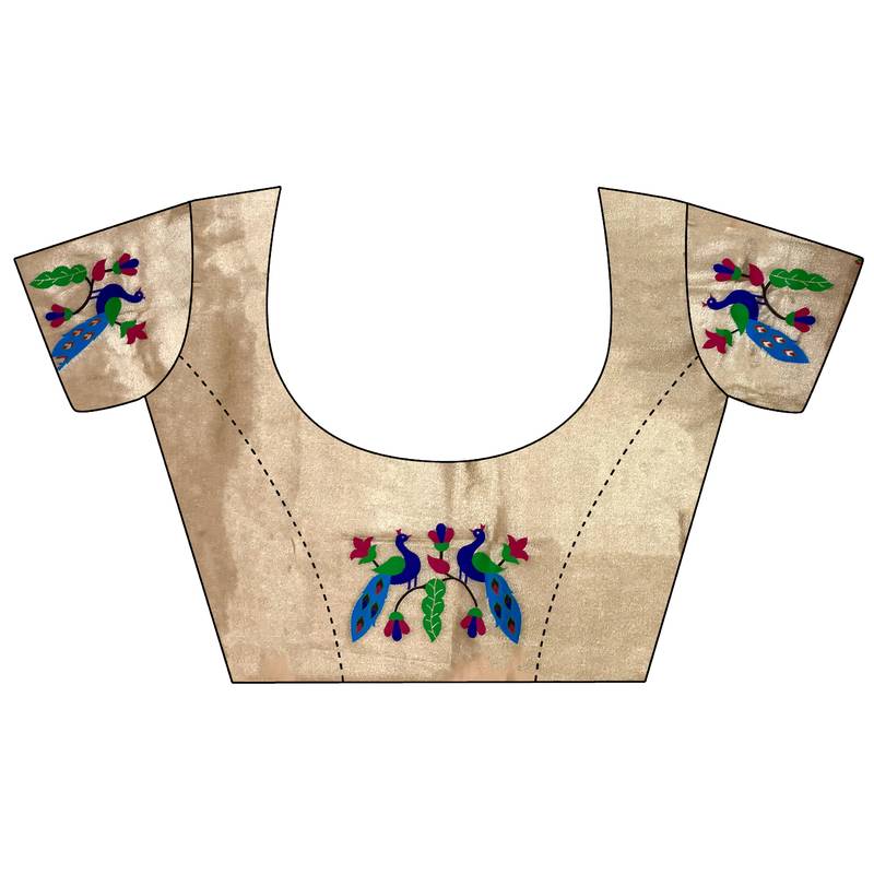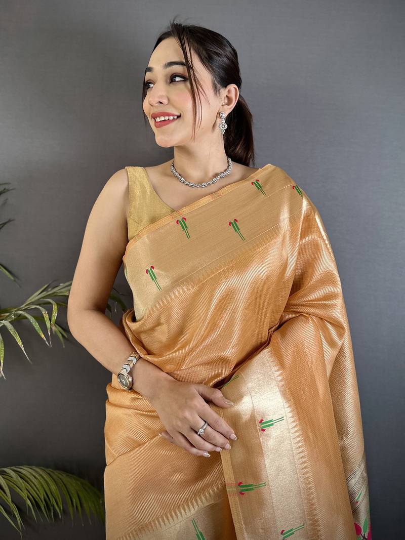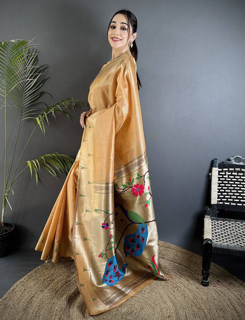 | Product Description | Shine Bright In This Gold Yellow Paithani Saree, Featuring Elegant Peacock & Floral Motifs. Its Tissue Fabric Offers A Lightweight, Flowing Drape Perfect For Festive And Traditional Occasions.