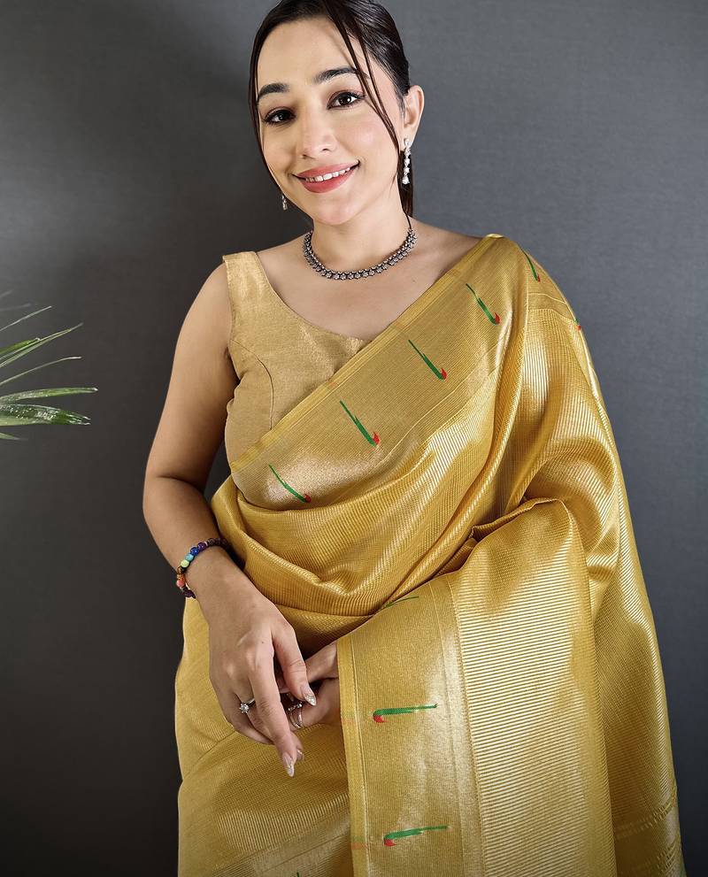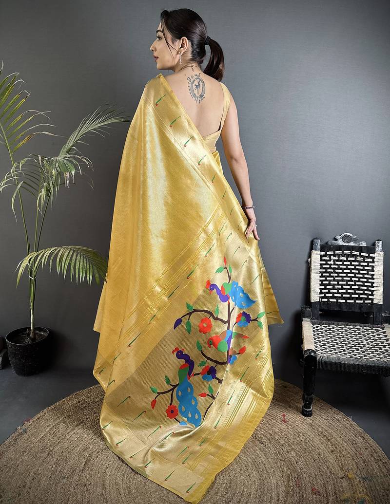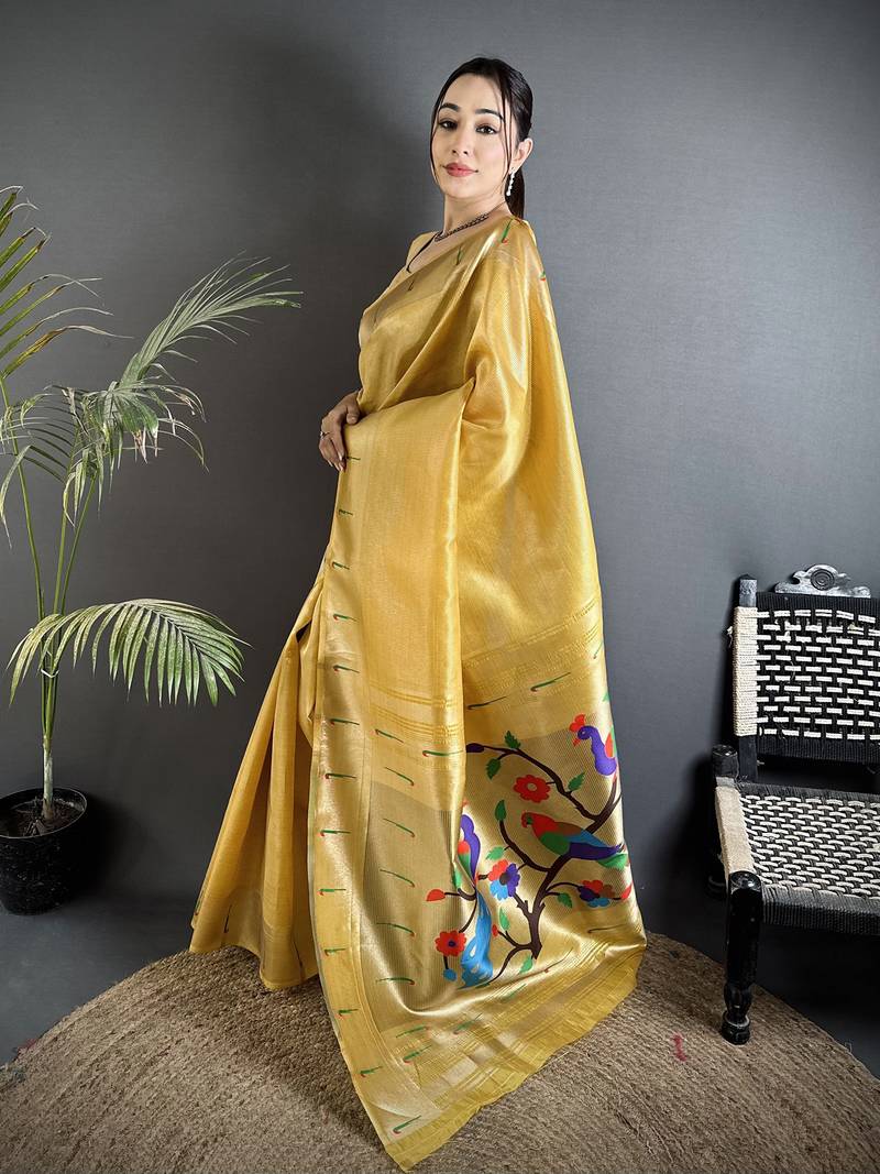 Golden yellow tissue minakari plain zari weaving paithani saree