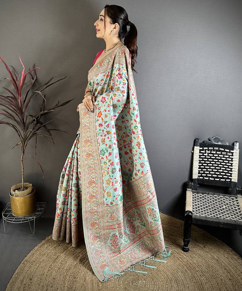 Light blue pashmina silk meenakari weaving madhubani design kashmiri saree