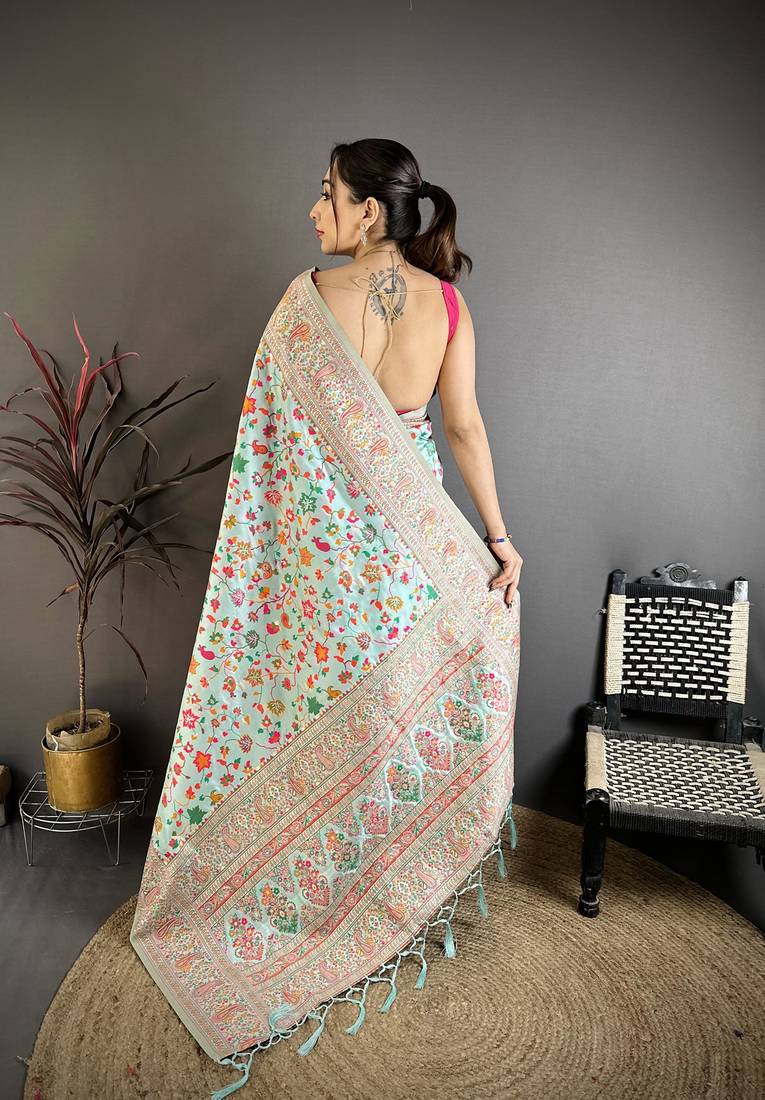 | Product Name | Light Blue Pashmina Silk Meenakari Weaving Madhubani Design Kashmiri Saree | |