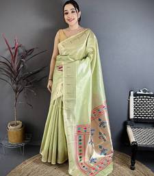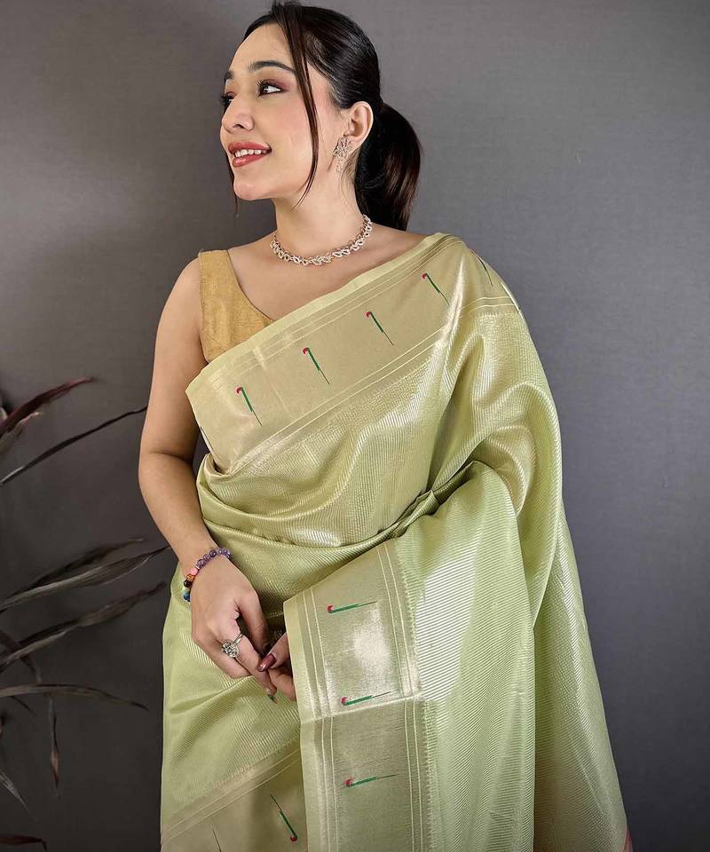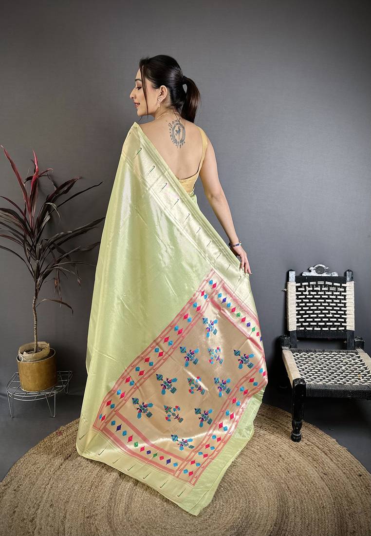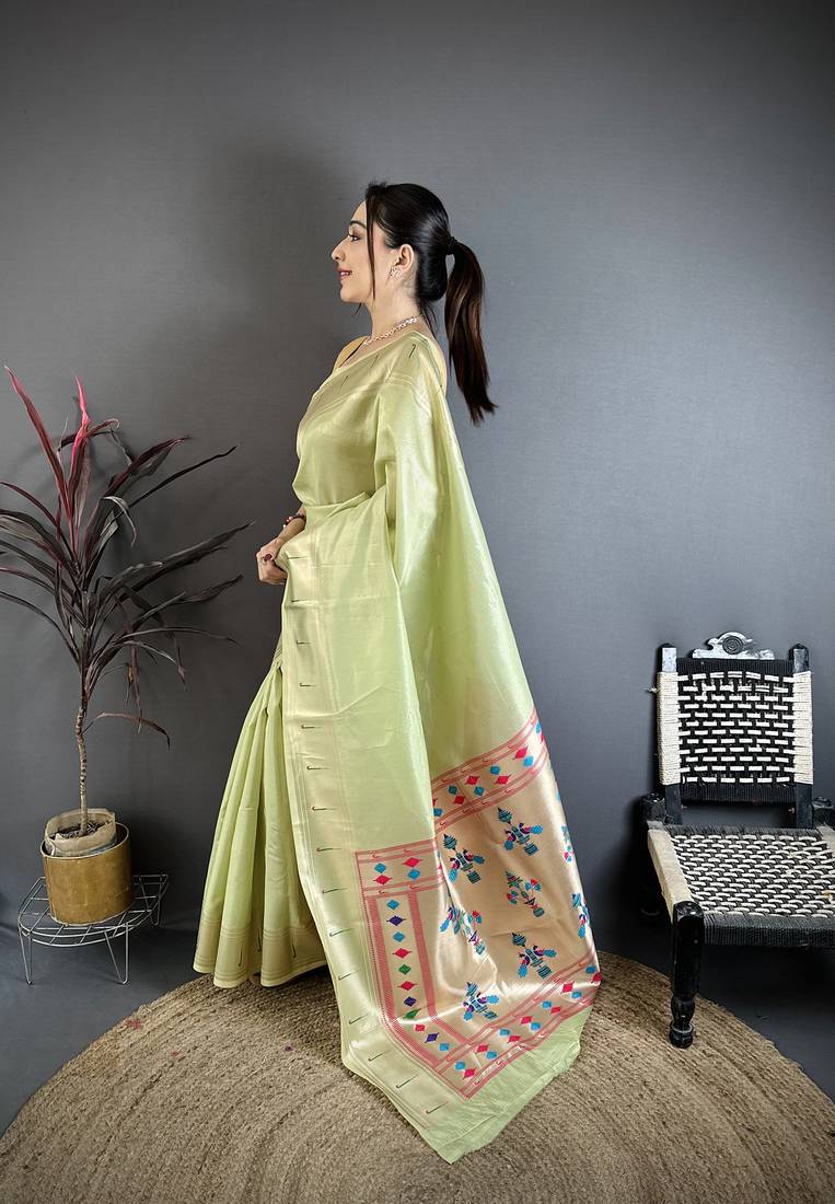 Light green tissue solid zari weaving paithani saree with muniya border