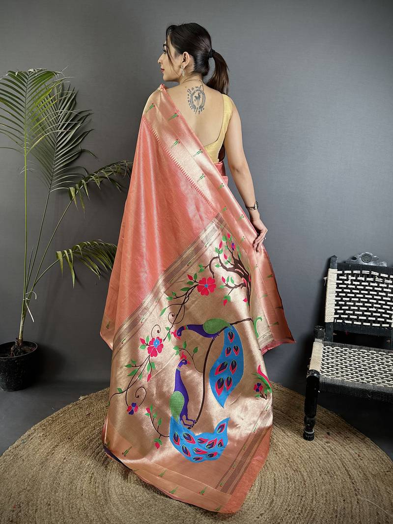 Light orange tissue peacock & floral motifs mina zari weaving paithani saree