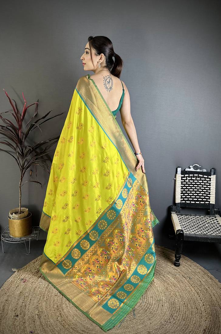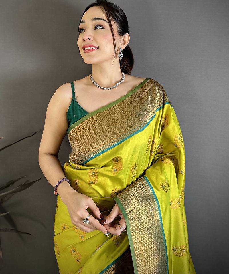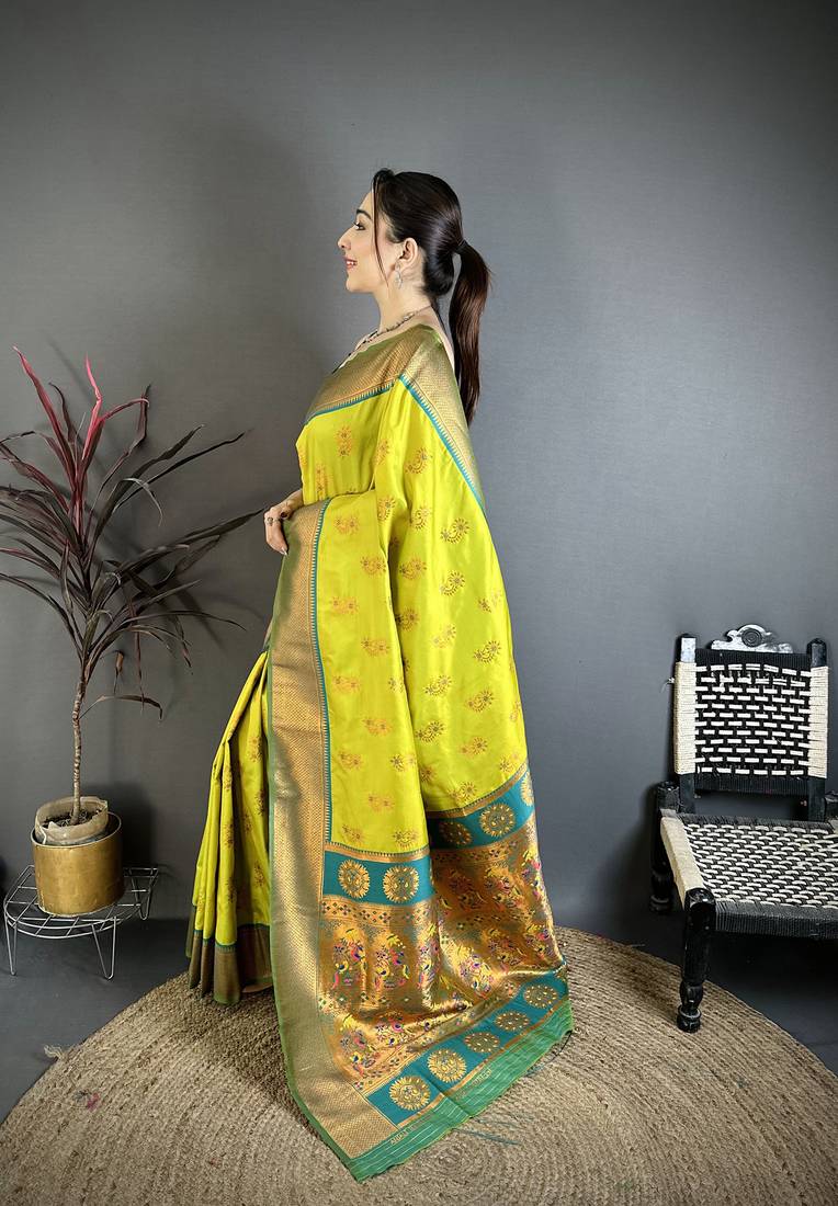 | Product Description | A Lime Green Soft Silk Paithani Saree Gives A Fresh And Bright Look For Any Occasion. The Smooth Fabric Feels Soft On The Skin And Stays Light All Day. It Drapes In An Easy Way And Gives A Neat Finish. This Saree Has Fine Meenakari And Zari Work That Adds A Soft Shine Without Making It Heavy. The Border And Pallu Show Simple Design With A Classic Feel. It Goes Well With Light Jewelry And Simple Styles. It Is A Good Choice For Festivals, Family Events, And Daily Wear. The Fabric Is Strong And Keeps Its Look With Proper Care. Easy To Wear And Handle, This Saree Fits Well In Every Wardrobe. |
