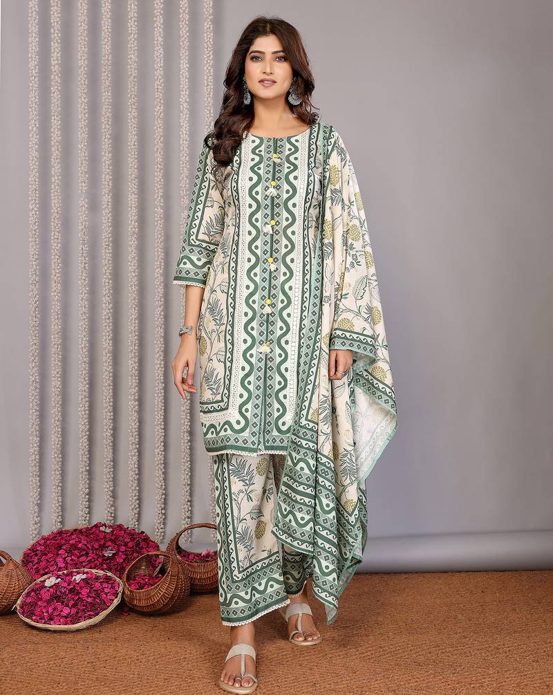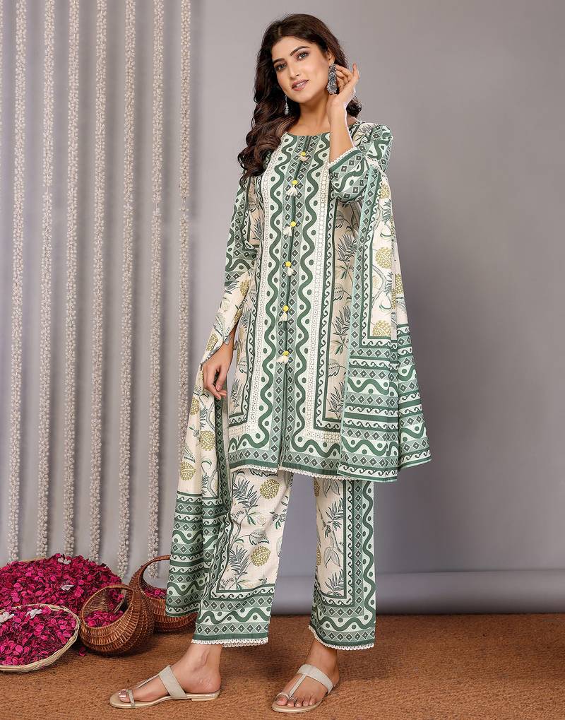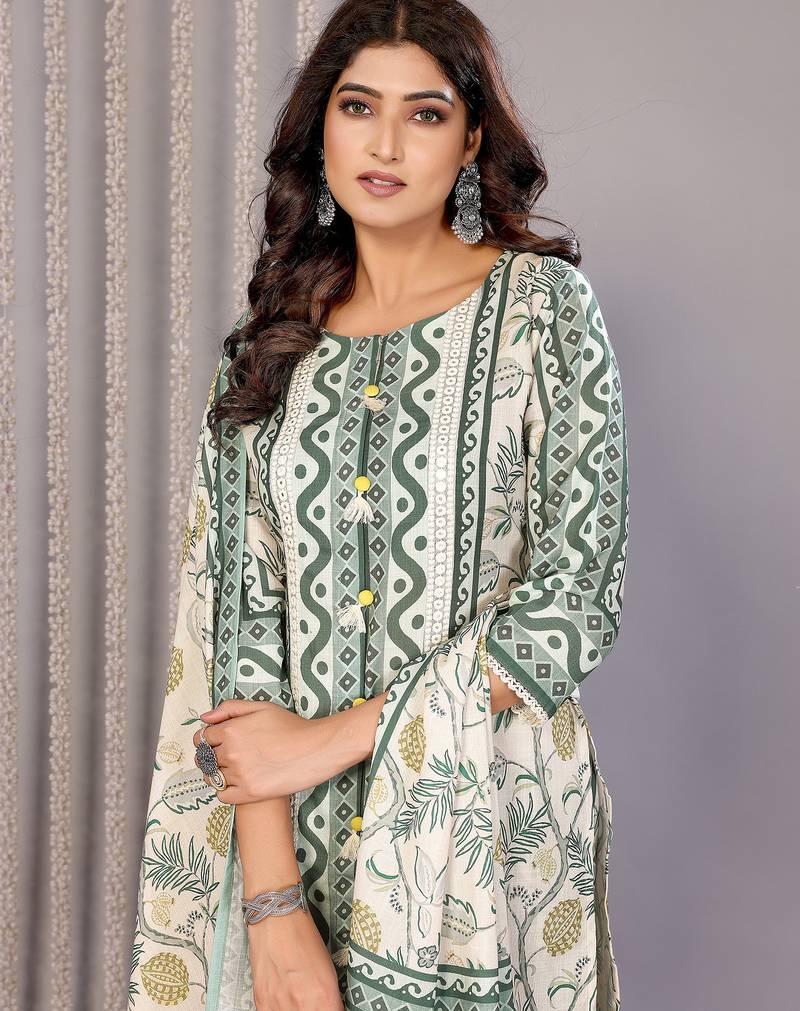 | Product Description | The Off White & Forest Green Linen Kurta Set Is Crafted From Soft, Breathable Linen, Making It The Ideal Choice For All Day Wear Whether You’re At The Office, Meeting Friends, Or Enjoying A Casual Outing. The Straight Kurta Provides A Relaxed Yet Flattering Fit That Gracefully Skims Your Body, Enhanced By A Chic Round Neckline And A Stylish Floral And Geometric Print. This Complete Three Piece Set Includes A Comfortable Kurta, Coordinating Bottom, And Matching Dupatta, Offering Effortless Ethnic Style For Any Occasion. With An Inclusive Size Range, You Can Easily Find Your Perfect Fit. Fabric: Linen (Soft & Breathable)