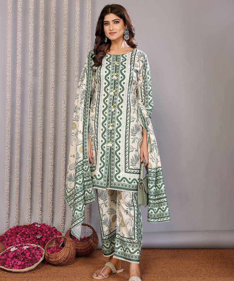 | Product Name | Off White & Forest Green Linen Floral & Geomatric Printed Straight Round Neck Kurta Set | |