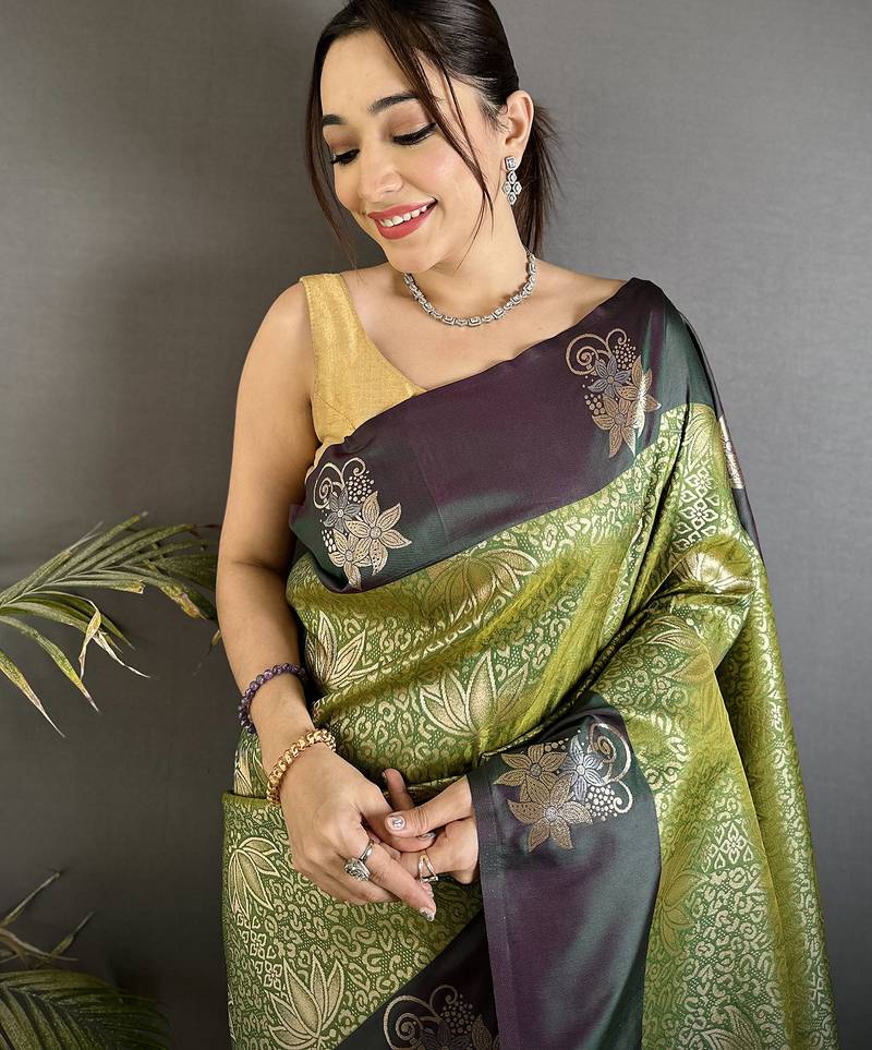 | Product Description | Experience Timeless Elegance With Olive Green Soft Silk Dharamvaram Saree, Adorned With Intricate Rose Gold Zari Weaving That Enhances Its Luxurious And Traditional Appeal. The Rich Olive Green Shade Adds Sophistication, Making It Perfect For Weddings, Receptions, And Festive Celebrations.