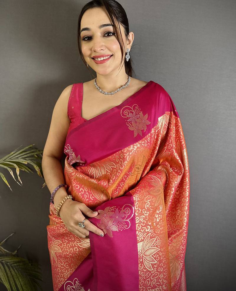 Orange soft silk blend intricate rose gold zari weaving dharmavaram saree