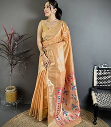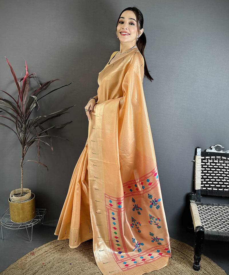 Orange tissue solid zari weaving paithani saree with muniya border
