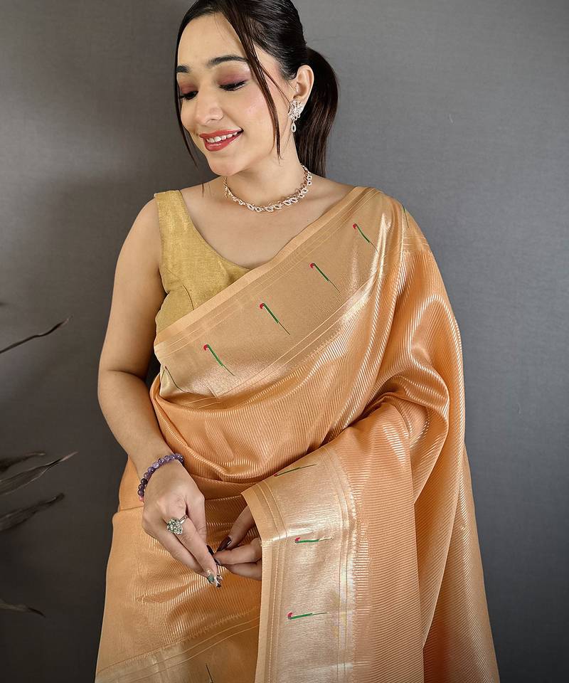 | Product Description | This Orange Tissue Solid Zari Weaving Paithani Saree Features A Bright Glow. The Fabric Feels Light And Sits Well On Any Body Type. It Is A Perfect Choice For Weddings Or Festive Family Events. The Saree Has A Classic Muniya Border That Adds A Traditional Touch. Its Gold Zari Weaving Shines Beautifully Under Lights. You Will Look Elegant And Feel Comfortable Throughout The Whole Day. The Solid Orange Color Makes It Easy To Pair With Gold Jewelry. This High Quality Tissue Material Is Durable And Soft. It Is A Timeless Piece That Every Woman Should Have In Her Ethnic Closet. |