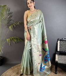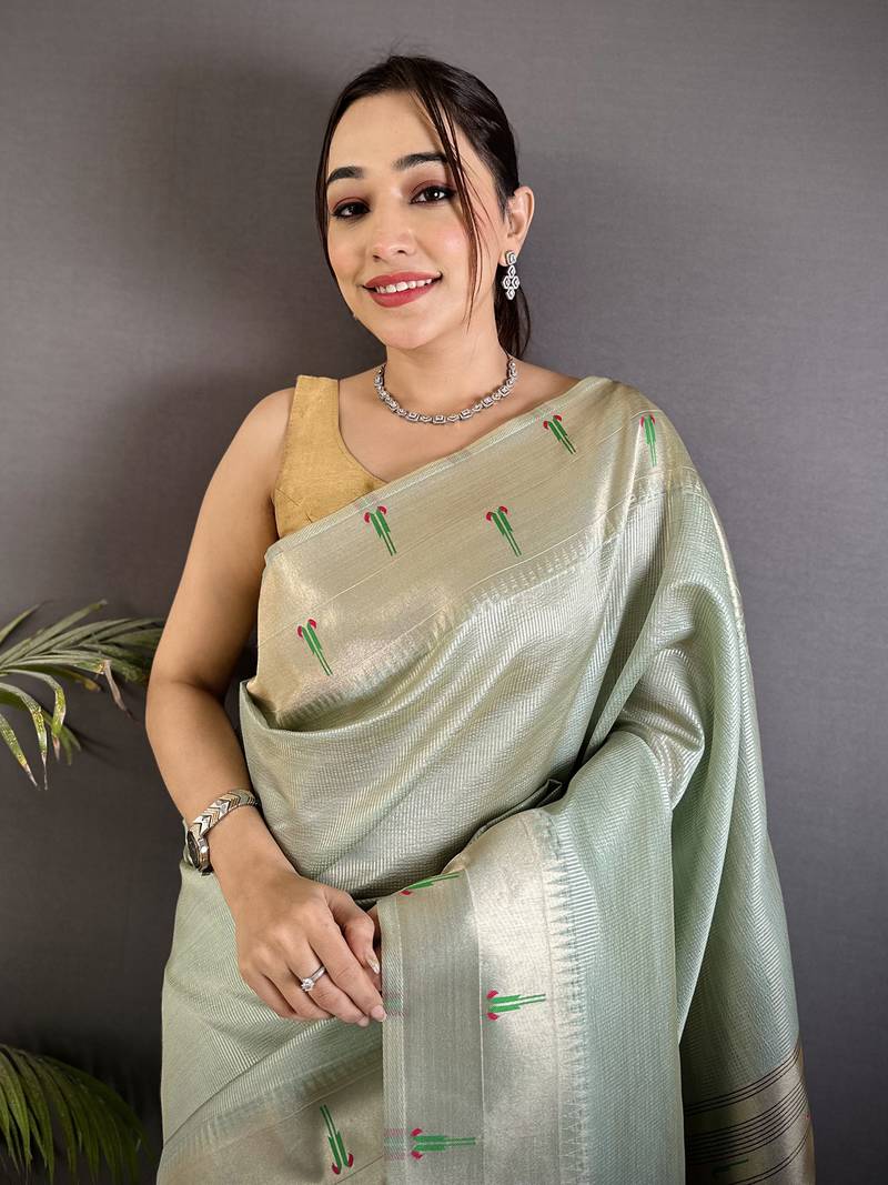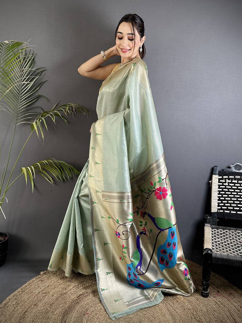 Pale blue tissue peacock & floral motifs mina zari weaving paithani saree
