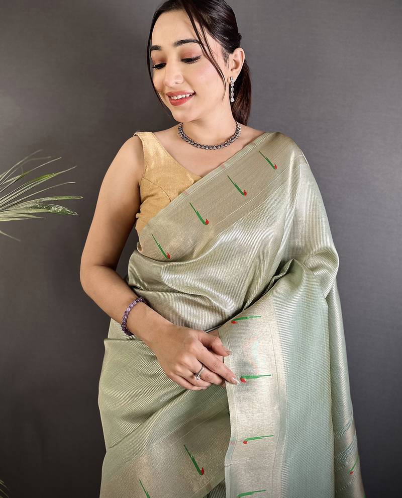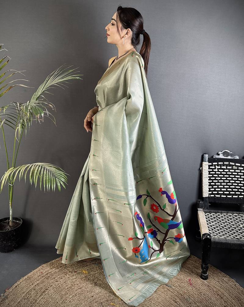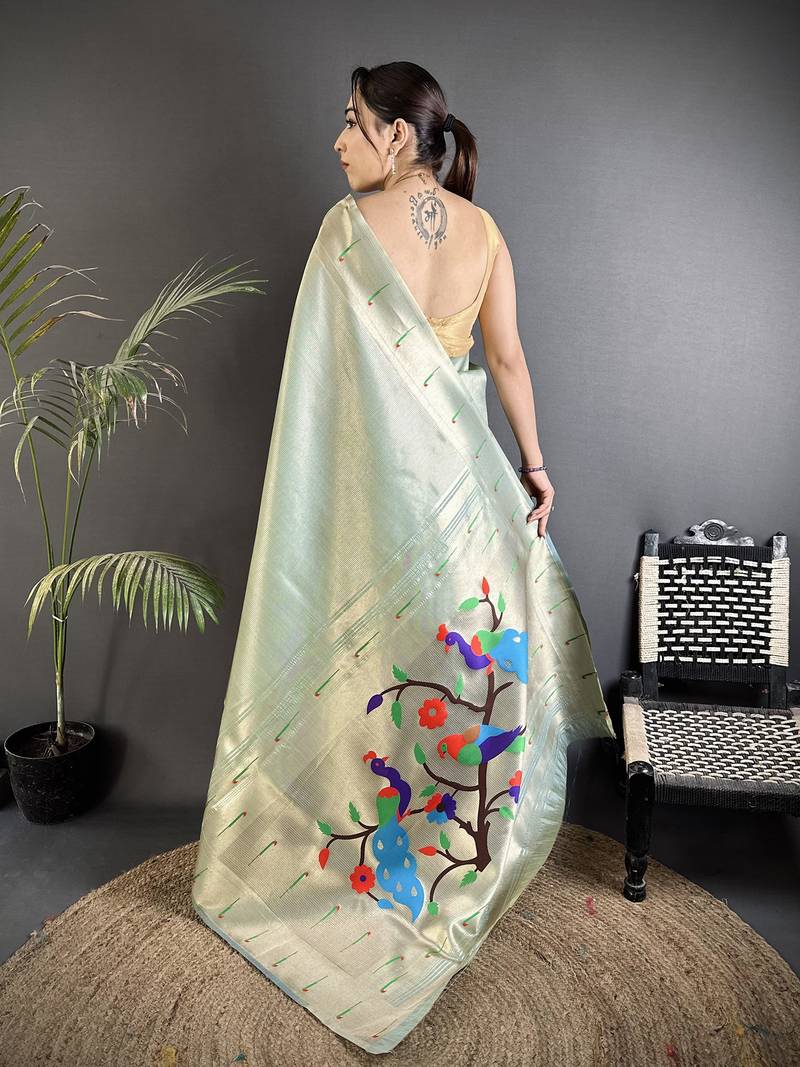 Pastel green tissue minakari plain zari weaving paithani saree