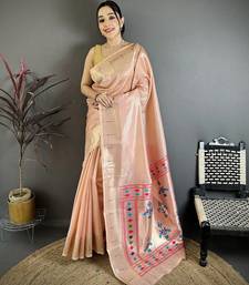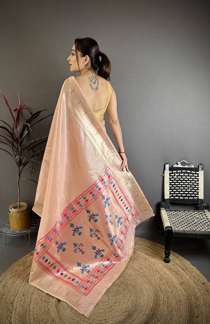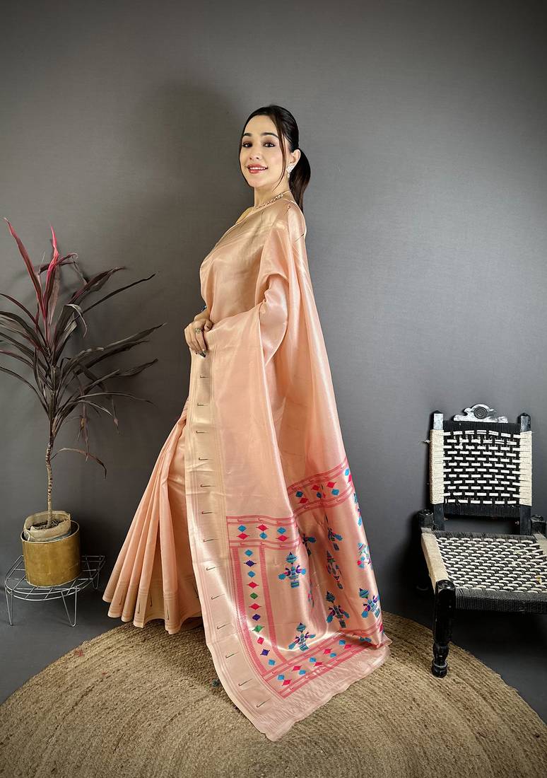 | Product Name | Peach Tissue Solid Zari Weaving Paithani Saree With Muniya Border | |
