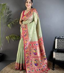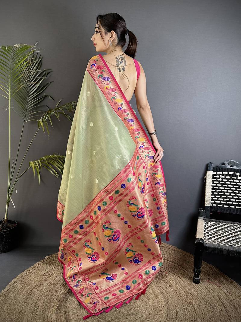 Pista green tissue zari weaving minakari work paithani saree with mor border