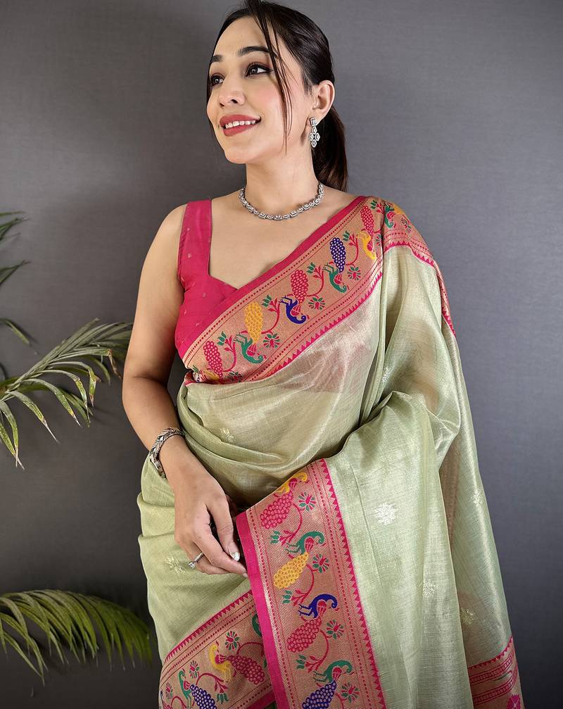 | Product Description | Enhance Your Ethnic Collection With This Pista Green Paithani Saree, Featuring Elegant Tissue Fabric And Intricate Zari Weaving. Ideal For Weddings, Festivals, And Traditional Events.