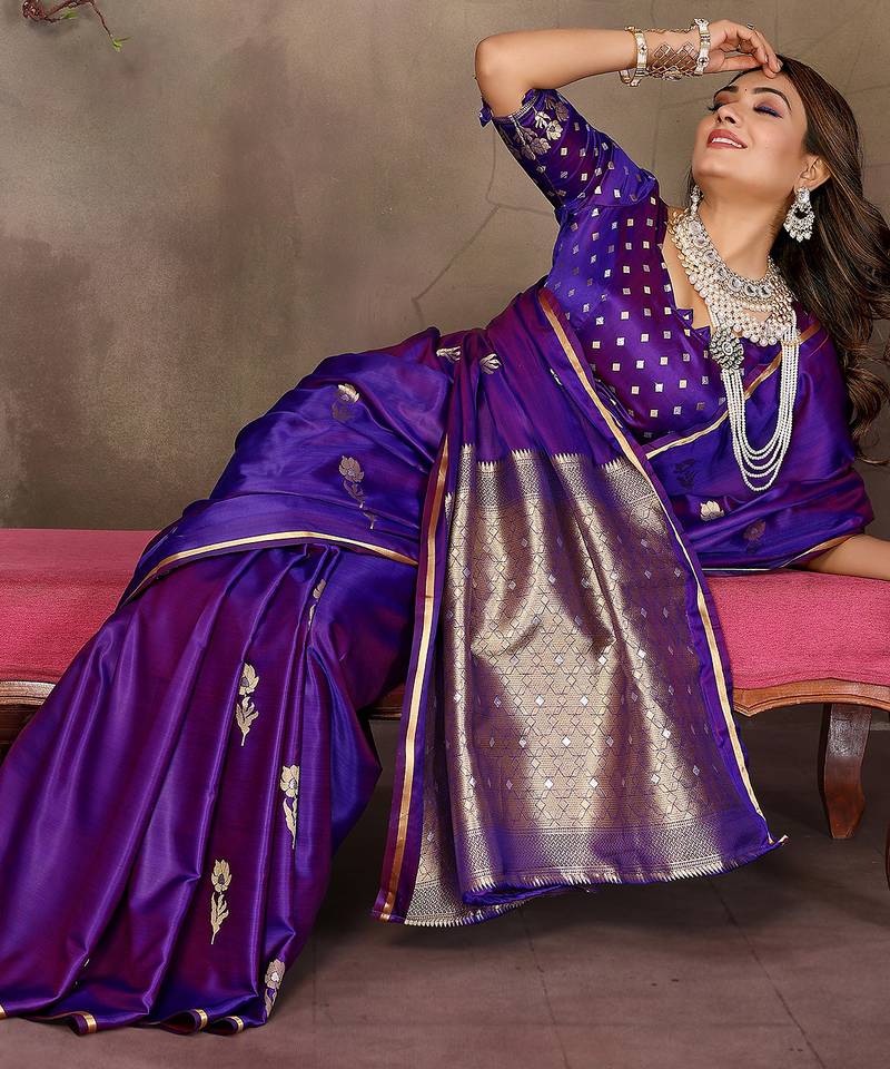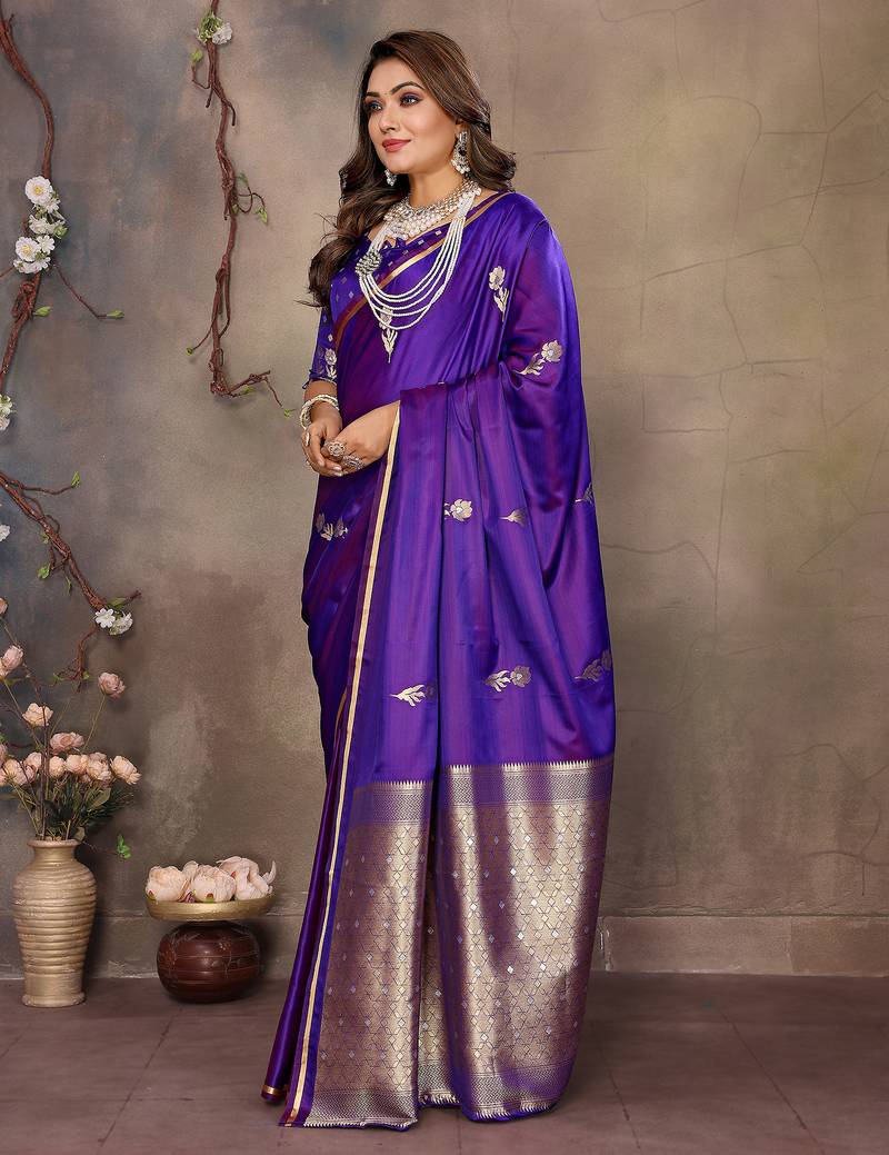| Product Name | Purple Satin Silk Blend Floral & Botanical Motifs Zari Woven Banarasi Saree | |
