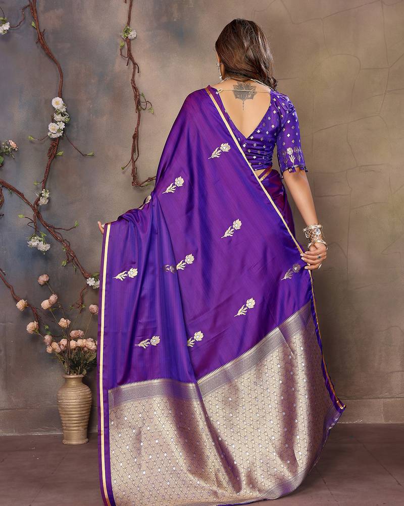 Purple satin silk blend floral & botanical motifs zari woven banarasi saree