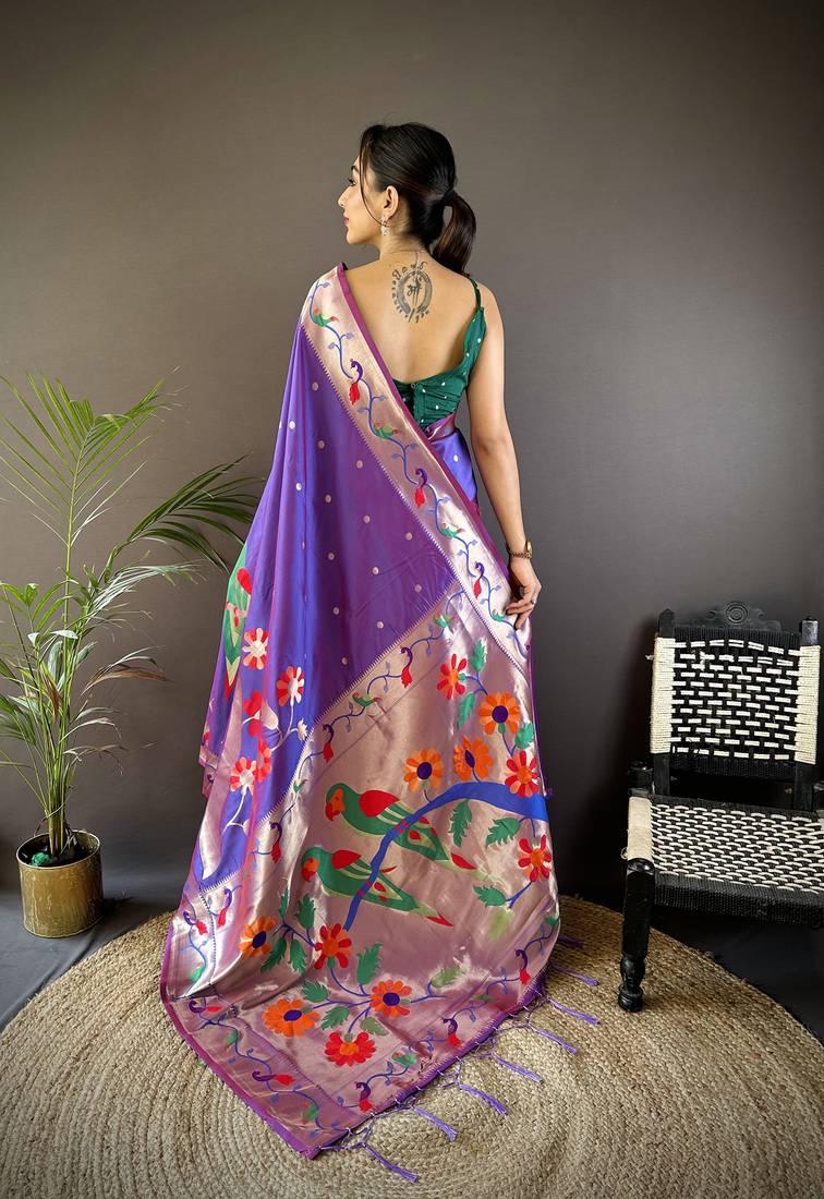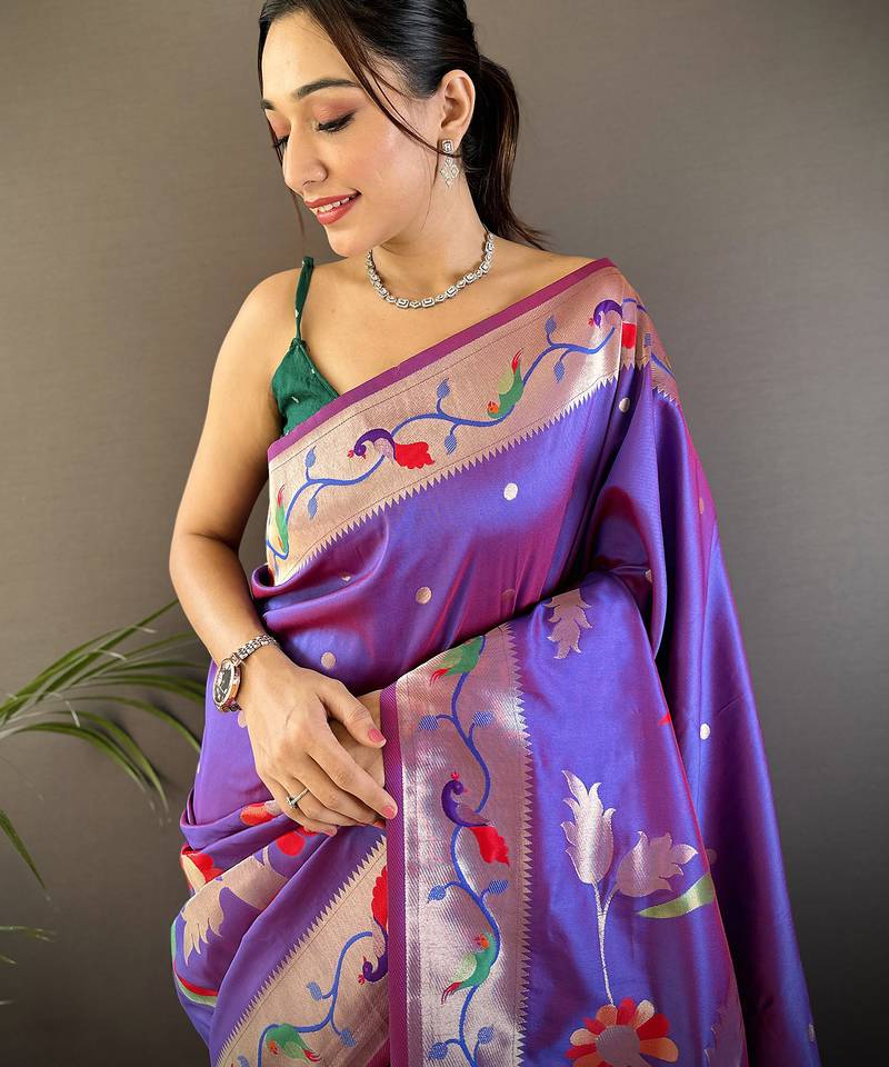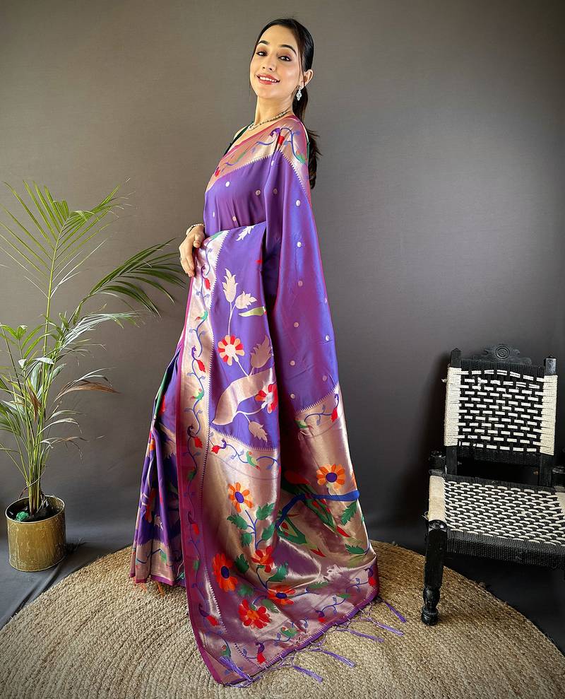 | Product Description | Turn Heads With This Purple Soft Silk Zari Woven Floral Paithani Saree, A Top Ranking Favorite From Elora Fashion! Woven With Intricate Zari Floral Motifs, This Saree Blends Traditional Elegance With Modern Flair, Making It One Of The Most Popular Women's Ethnic Wear Picks On Mirraw. Ideal For Weddings, Festive Celebrations, And Special Occasions, It’s A Bestseller That Radiates Sophistication And Style.