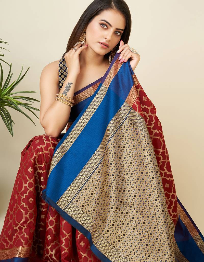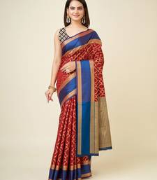 Red lichi silk blend woven design jacquard weaving kanchipuram saree