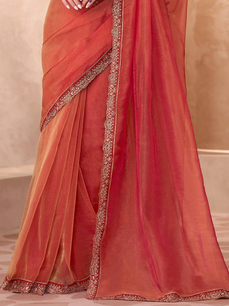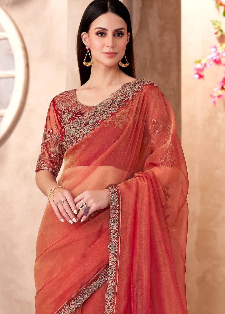 | Product Description | Make A Statement In This Rust Orange Sparkle Tissue Partywear Saree. The Soft Tissue Fabric Drapes Effortlessly, While Heavy Embroidery And Sequins Add A Dazzling Shine For Weddings, Receptions, And Festive Nights.