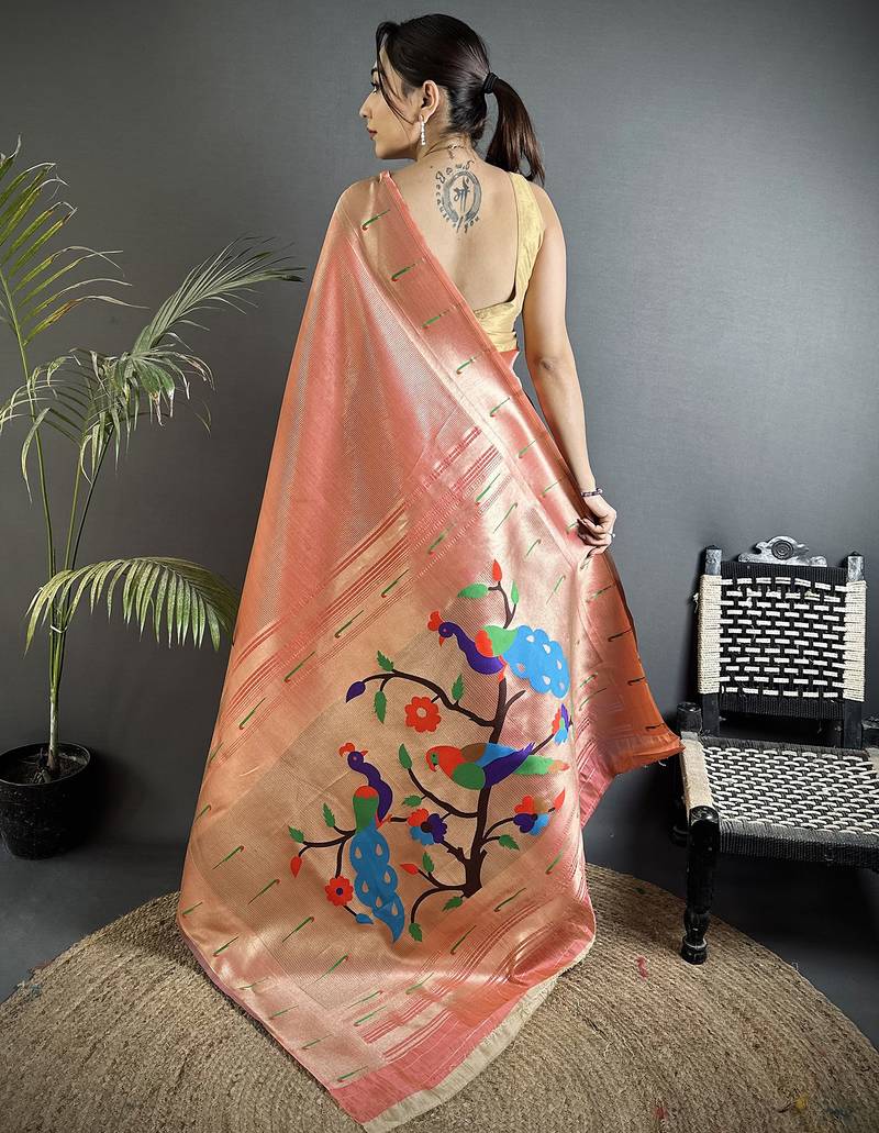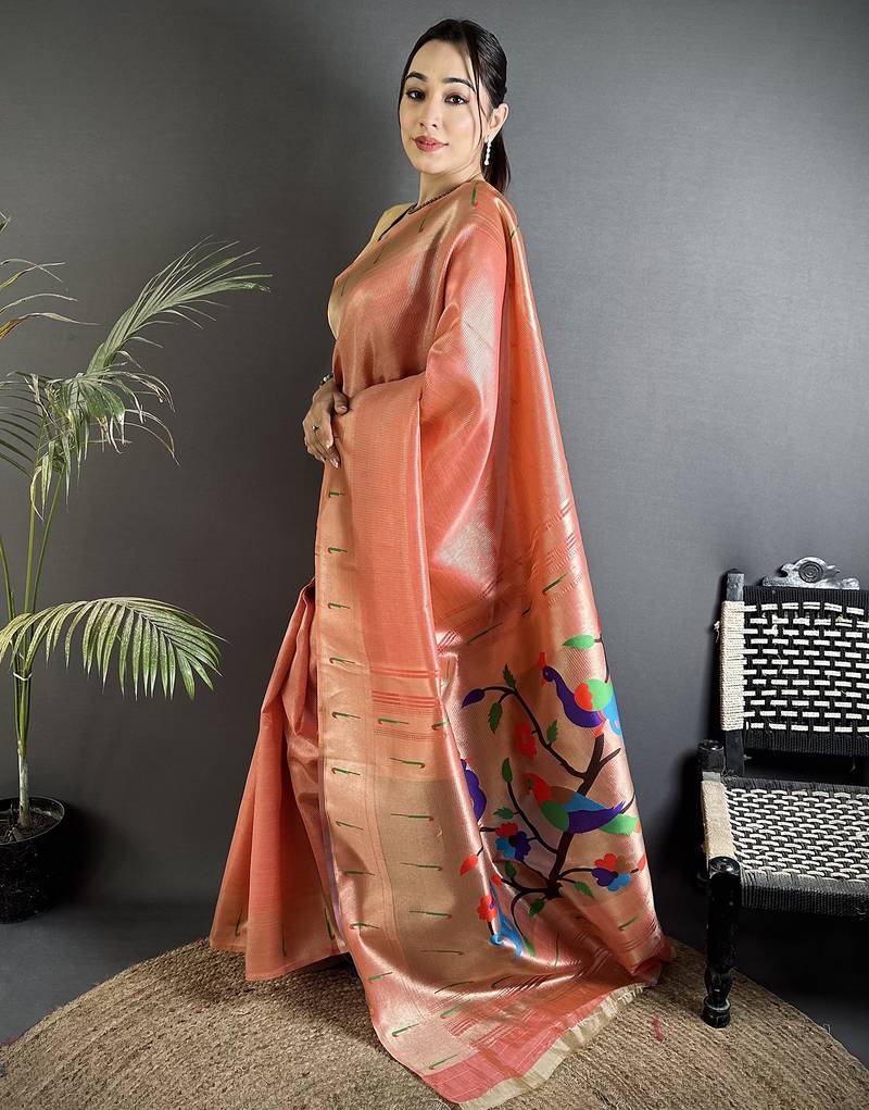Rust orange tissue minakari plain zari weaving paithani saree