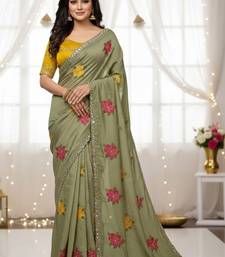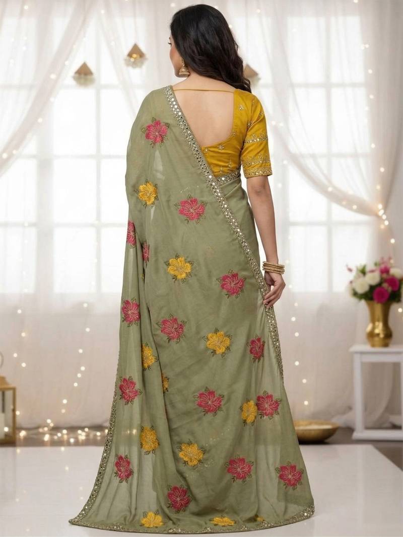 Sage green star georgette floral motifs embroidered work saree with mirror work border