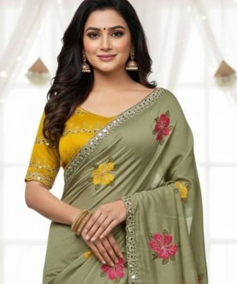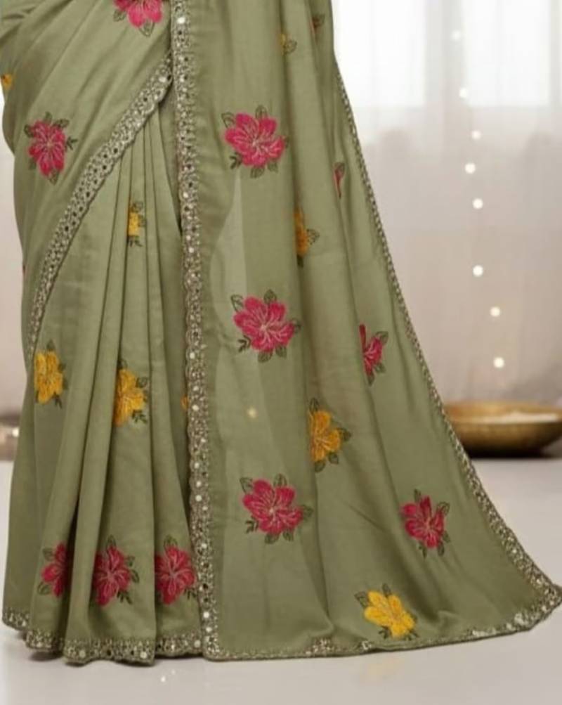 | Product Name | Sage Green Star Georgette Floral Motifs Embroidered Work Saree With Mirror Work Border | |