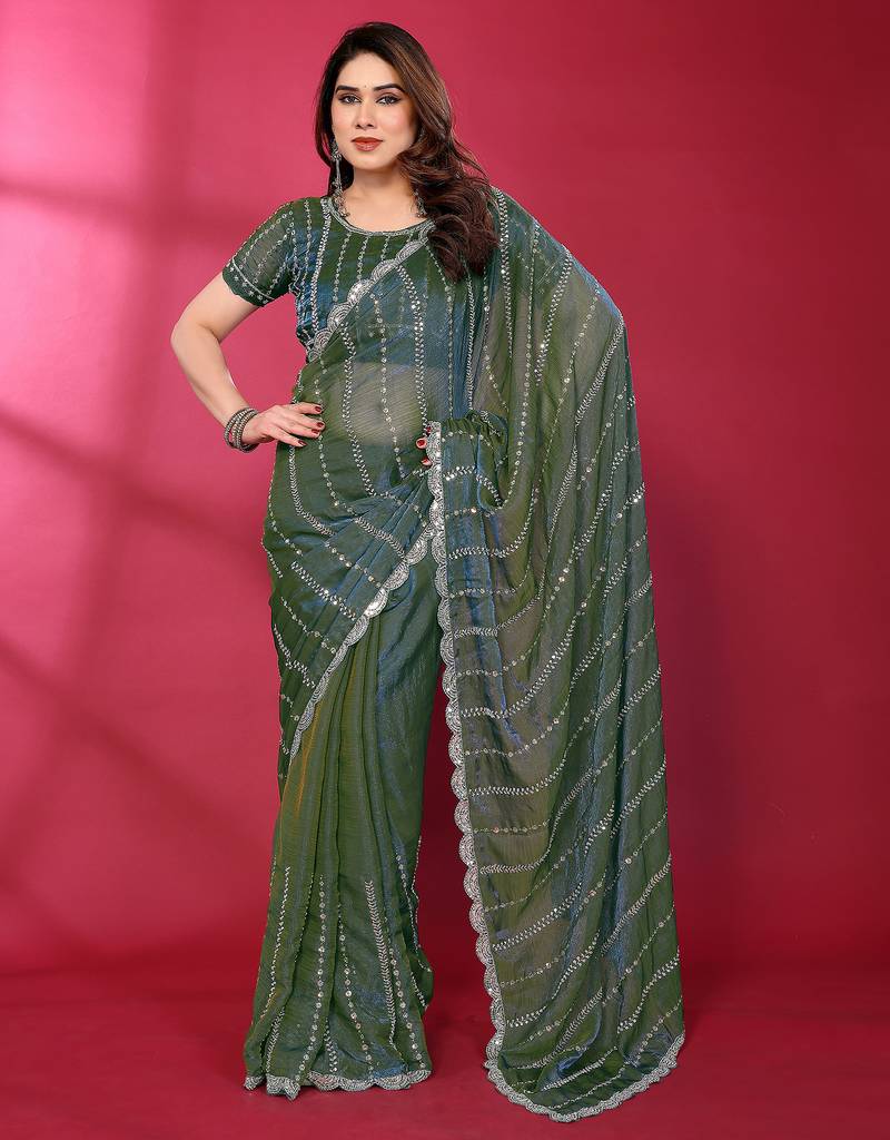 Teal fendy silk linear sequence beads work bollywood saree