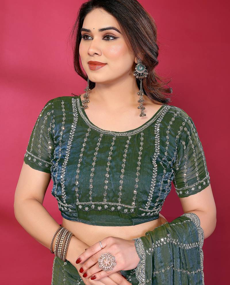 The Teal Fendy Silk Linear Sequence Beads Work Bollywood Saree Brings A Fresh And Stylish Look For Every Occasion. The Soft Silk Fabric Feels Smooth And Drapes Beautifully For A Clean, Elegant Style.
