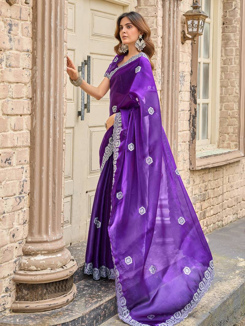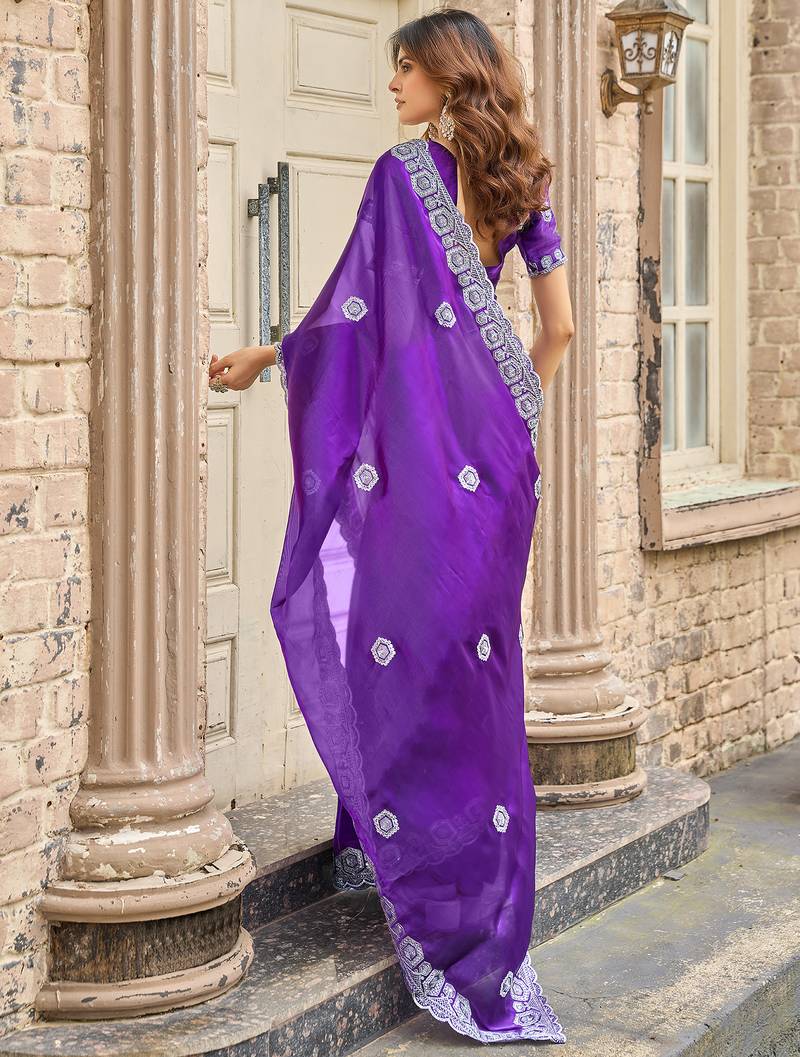 Violet shimmer chiffon geomatric embroidery work bollywood saree