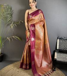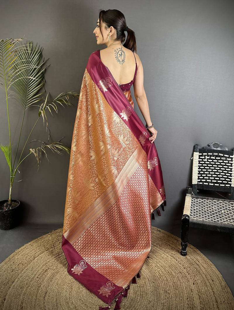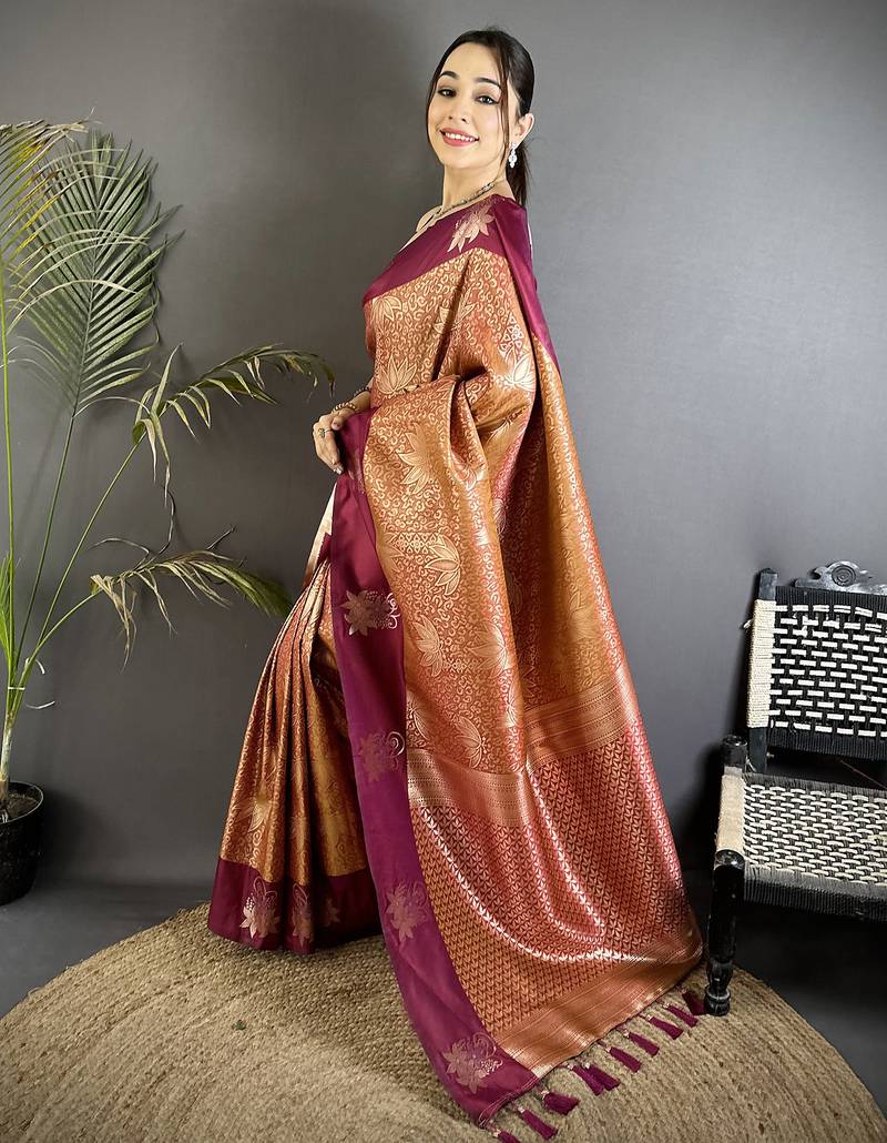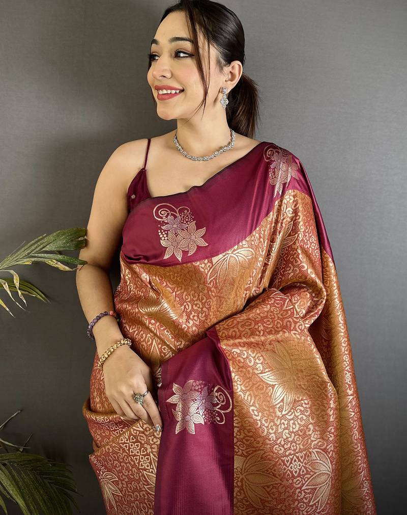 Wine soft silk blend intricate rose gold zari weaving dharmavaram saree
