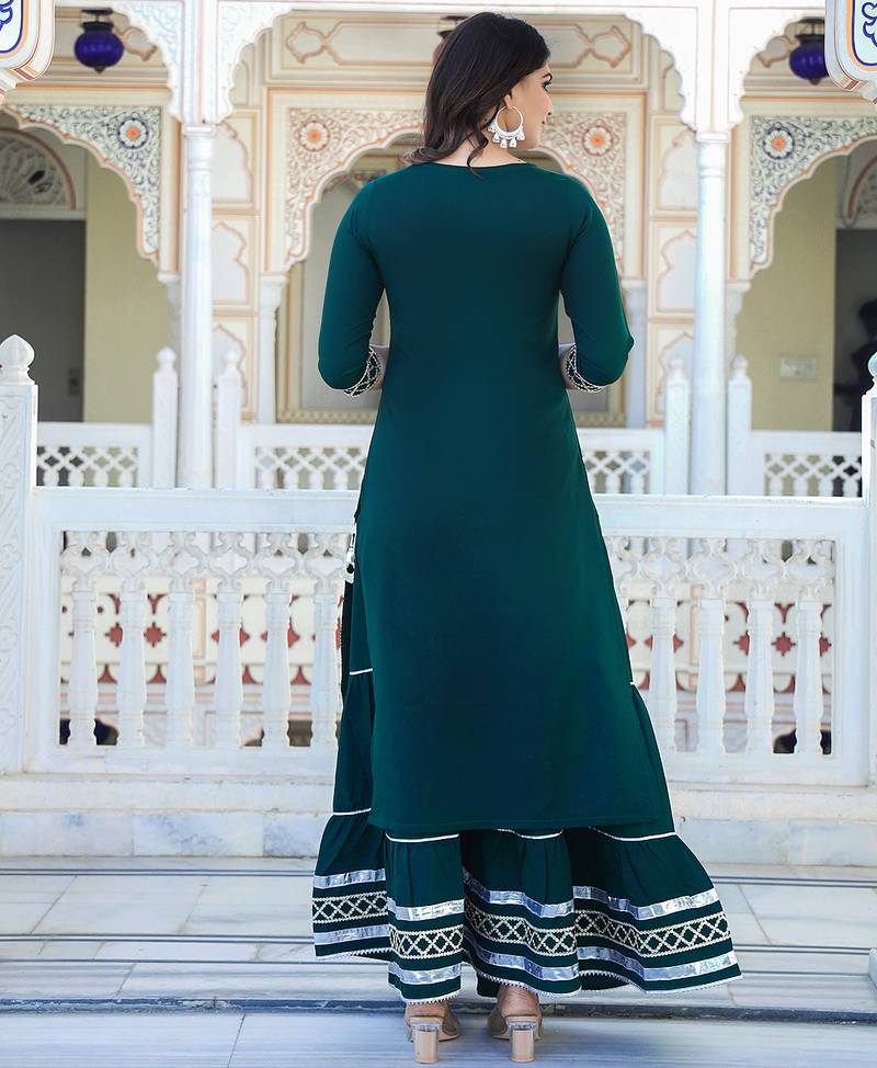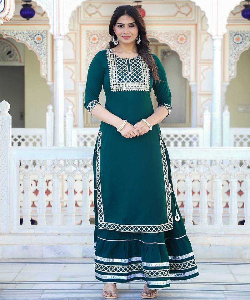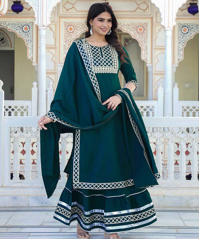 This Beautiful Ethnic Ensemble Is A Women's Embroidered Regular Sequinned Kurta With Skirt And Dupatta By The Brand Elvish Jaipur. It Is Available In Elvish Jaipur's Official Store. The Set Features A Solid Colored Kurta With Intricate Embroidery And Sequinned Details. The Overall Look Has Traditional Dori Work, Which Gives It A Festive Appeal. The Set In The Image Is A Rich Teal Green (Also Described As A Deep Green Or Bottle Green).The Kurta Has A Straight Shape, A Round Neck, And Three Quarter Regular Sleeves, Reaching Calf Length. The Skirt Features An Elasticated Waistband And Is A Slip On Closure.The Fabric Is Typically Described As Art Silk, Offering Comfort And A Gentle Sheen.This Type Of Outfit Is Considered Ethnic Wear Suitable For Festive Celebrations, Weddings, Family Gatherings, And Parties.