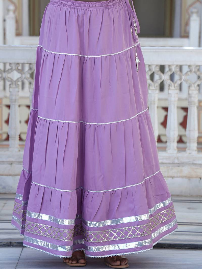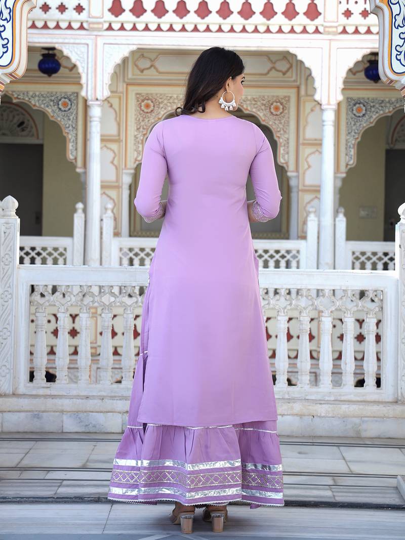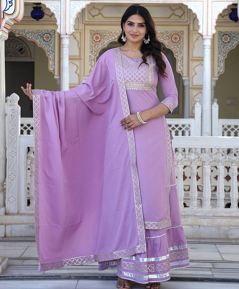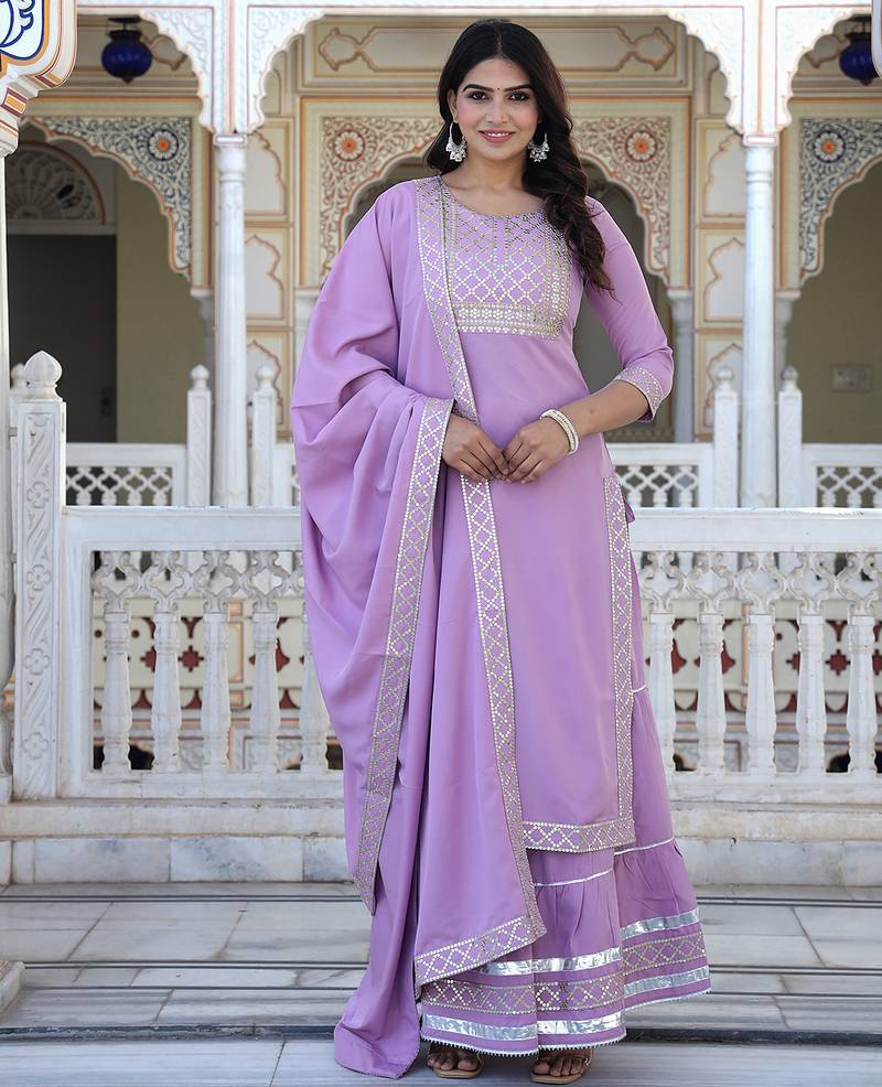 This Traditional Outfit Is A Light Baby Pink Sharara Suit Set With Extensive Silver Gota Patti & Sequin Work. The Ensemble Typically Includes A Straight Cut, Flared Sharara, And A Matching Dupatta. Product Details,Color: Light Baby Pink. Work/Embellishments: Features Intricate Silver Detailing, Which Includes Gota Patti And Sequnce Work (Traditional Silver Or Gold Lace Like Embroidery), Sequins, And Thread Work.Style: An Indian Ethnic Wear Set, Perfect For Festive Occasions, Weddings, Or Parties. Components: Usually A Three Piece Set Comprising: Kurti: A Calf Length Top With A Round Neckline And Three Quarter Length Sleeves, Adorned With Embroidery At The Neckline And Hem. Sharara: Flared Sharara That Gather At The Knees Or Lower Leg, Featuring The Silver Border Detailing. Dupatta: Matching Febric Dupatta With Embroidery Lace Along The Edges.
