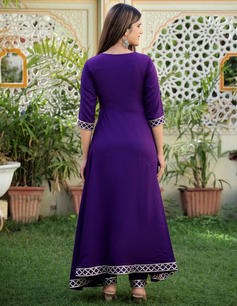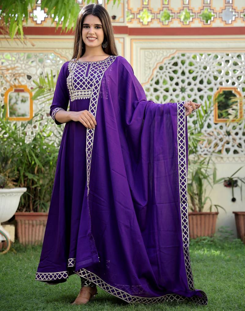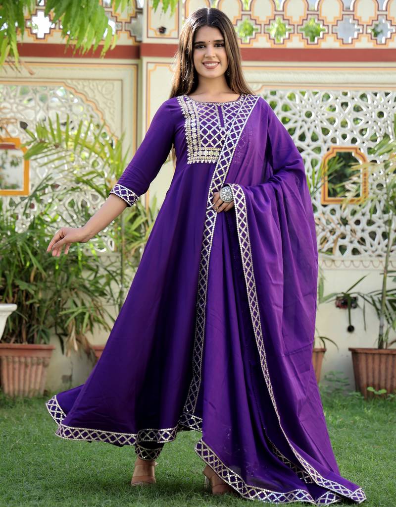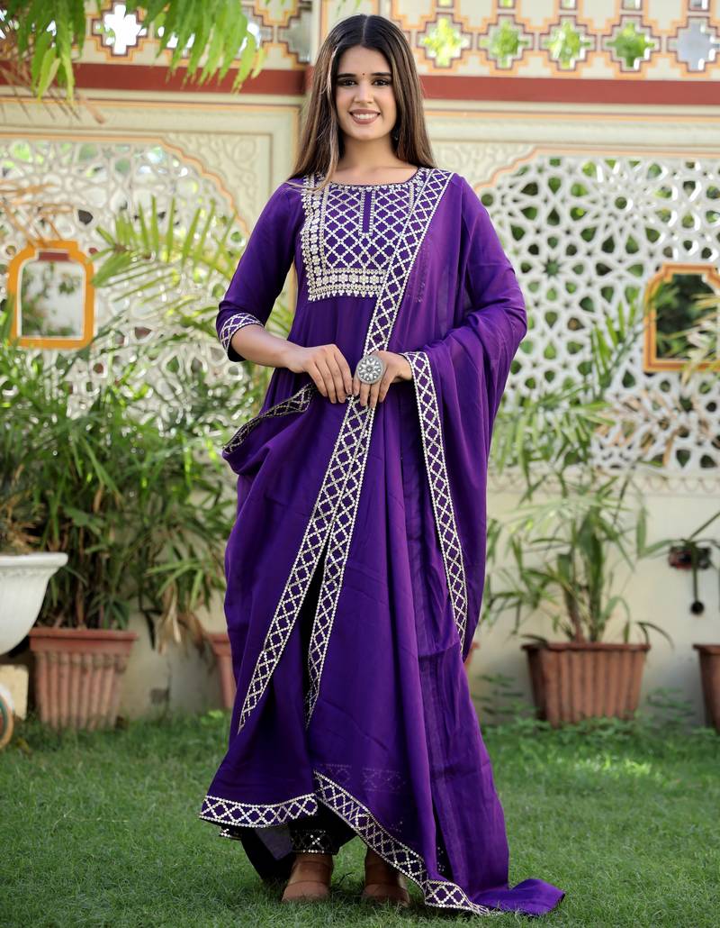 This Ethnic Ensemble Is A Purple Anarkali Kurta Set With Pants And A Dupatta, Featuring Gold Toned Embroidery And Detailing. ! Product Description Style: The Outfit Is An Anarkali Style Kurta Set, Which Is A Popular Form Of Indian Ethnic Wear Known For Its Flared Silhouette. Color & Design: The Primary Color Is A Rich Purple Or Violet With Ethnic Motifs And I Tricate Gold Toned Embroidery Or Zari Work Accents On The Yoke (Neckline Area), Sleeves, And The Flared Hemline Of The Kurta. Fabric: The Common Fabric For This Style Is A Comfortable And Breathable Material Like Rayon Or A Rayon Blend. Components: It Is A Three Piece Set That Typically Includes A Calf Length Kurta, Matching Trousers Or Pants (Often In A Straight Cut Style), And A Coordinating Dupatta With A Border Detail. Occasion: This Type Of Outfit Is Versatile And Considered Suitable For Traditional Wear, Casual Outings, Festive Occasions, Parties, And Evening Wear.