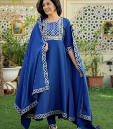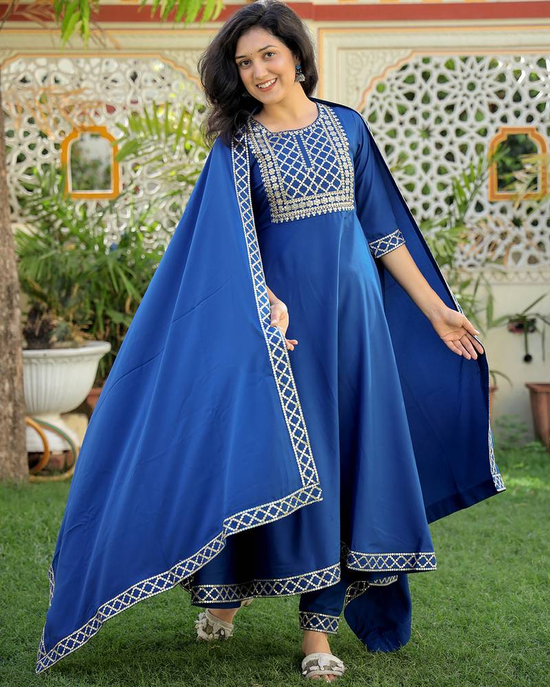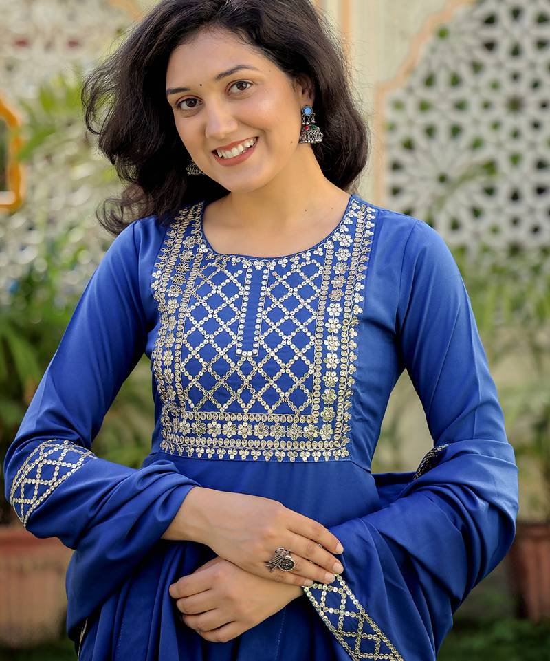| Product Description | It Is A Traditional Indian Anarkali Style Outfit, Which Includes A Long, Flowing Kurta (Top), Coordinating Pants, And A Matching Dupatta (Scarf). Color: The Primary Color Is A Rich, Royal Blue. Details: The Kurta Features Intricate Geometric Embroidery And Sequin Work Around The Neckline And Bodice. The Hemline Of The Kurta, The Sleeves, The Edge Of The Pants, And The Borders Of The Dupatta Are Adorned With A Distinctive Gold Lace Border With A Criss Cross Pattern. Material: The Fabric Is Often Described As A Heavy Rayon Or Geo Gette Blend, Known For Its Soft Drape And Comfort. Occasion: This Type Of Outfit Is C Nsidered Suitable For Festive Occasions, Parties, And Weddings. |