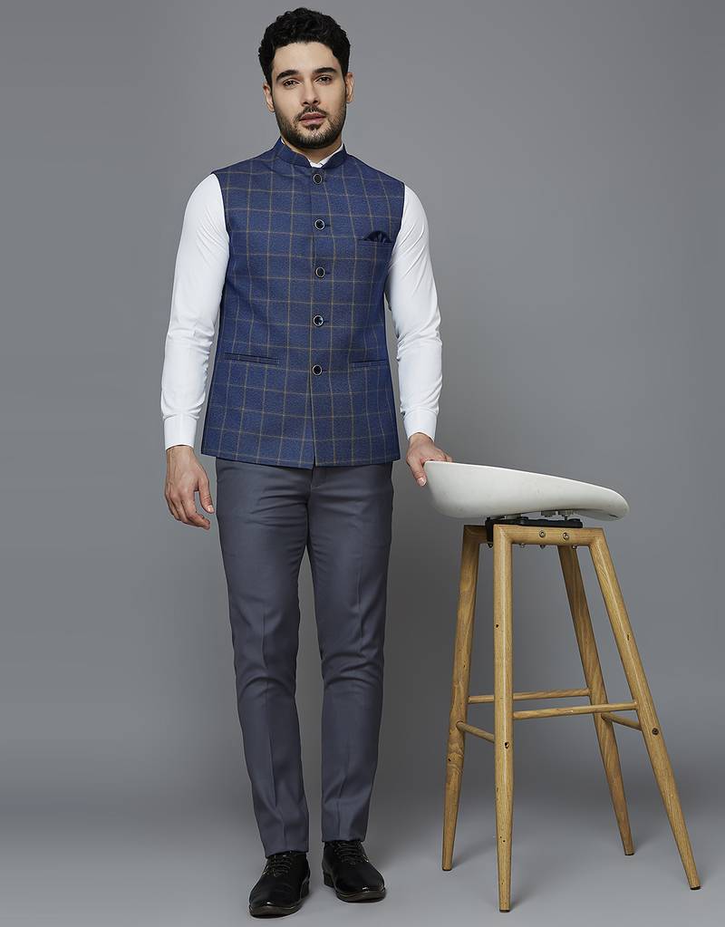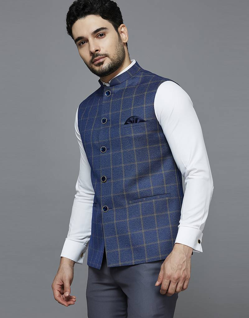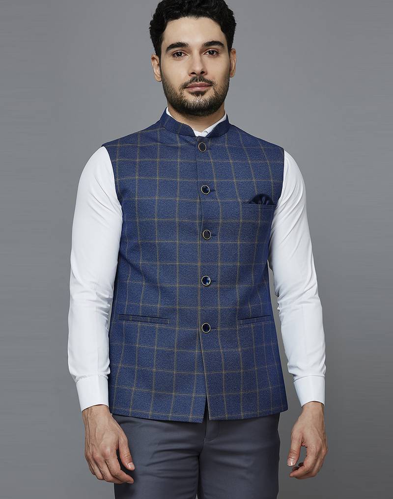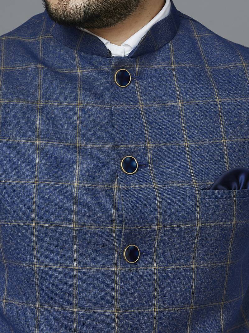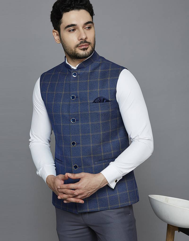| Product Description | Blue Nehru Jacket With Golden Yellow Chex And Texture, Comes With A Mandarin Collar (Bandhgala), Straight Button Placket, 3 Welt Pockets And A Pocket Square. |