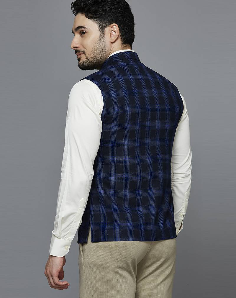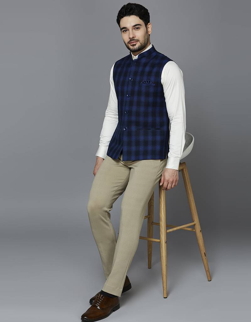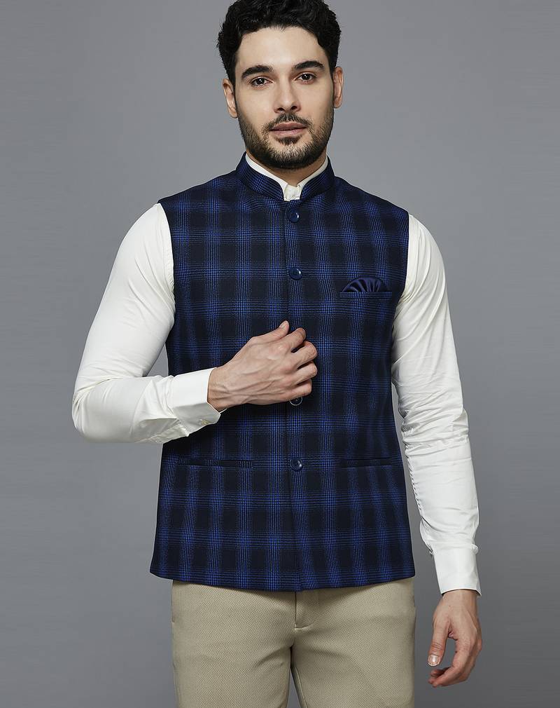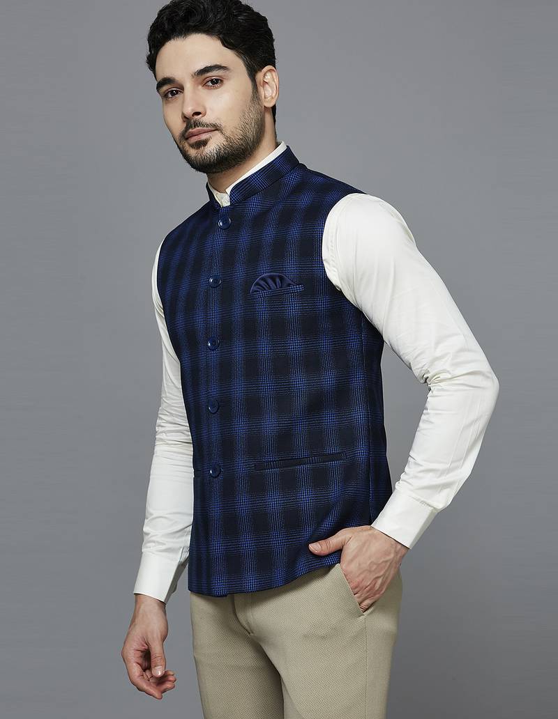 | Product Description | Deep Blue Nehru Jacket With Royal Blue Multi Lines Chex, Comes With A Mandarin Collar (Bandhgala), Straight Button Placket, 3 Welt Pockets And A Pocket Square. |