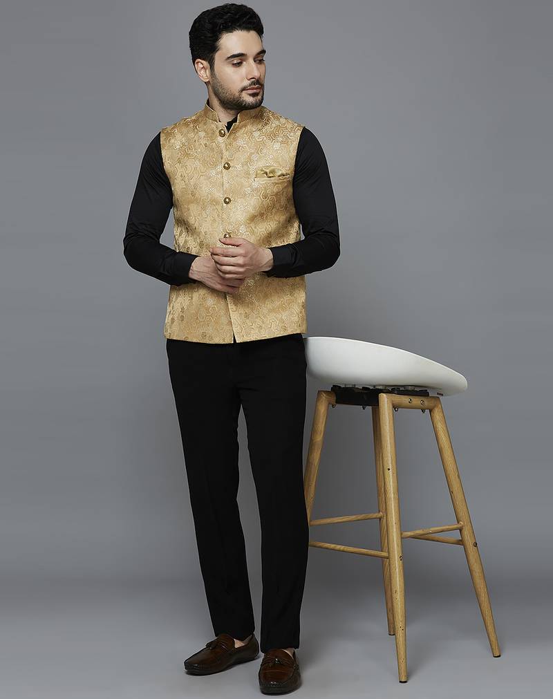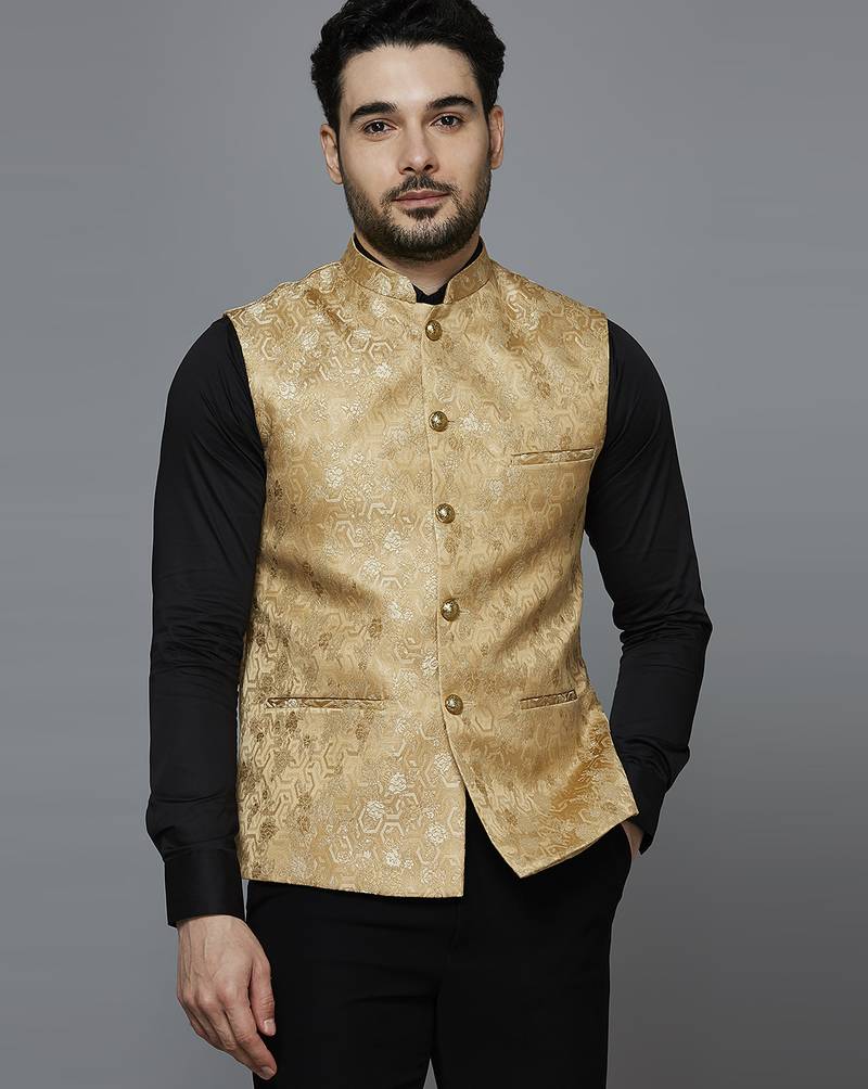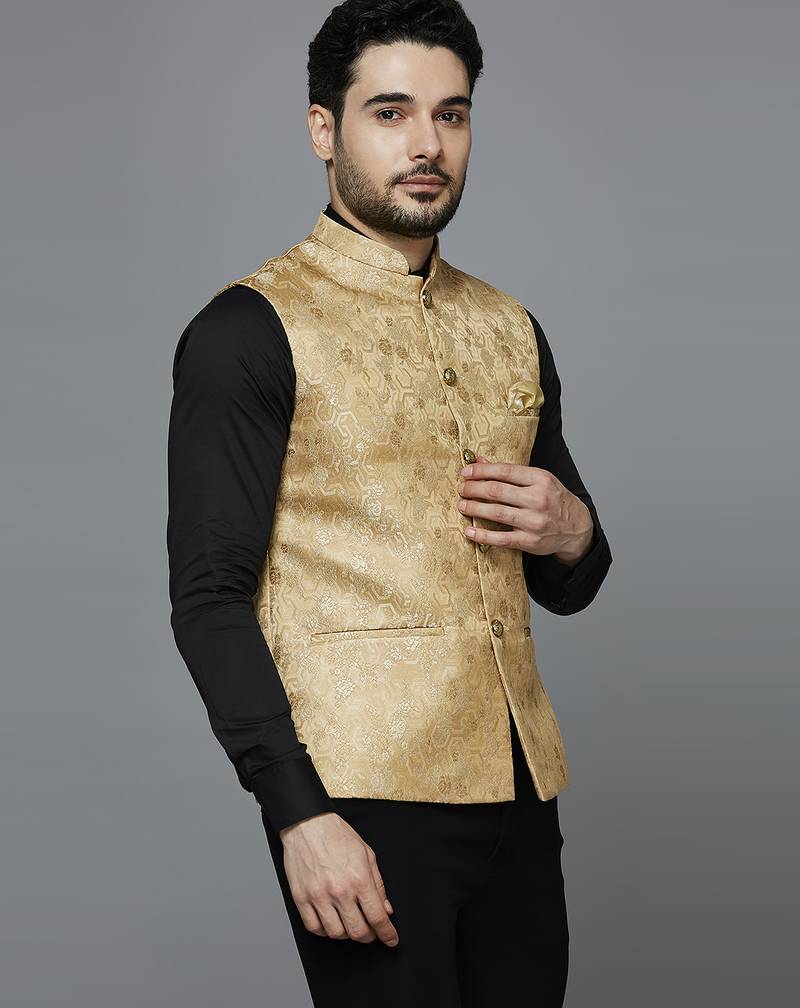 | Product Description | Golden Ethnic Motif Jacquard Nehru Jacket, Comes With A Mandarin Collar (Bandhgala), Straight Button Placket, And 3 Welt Pockets. |