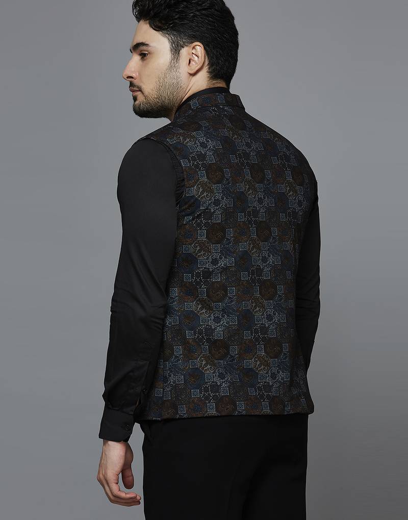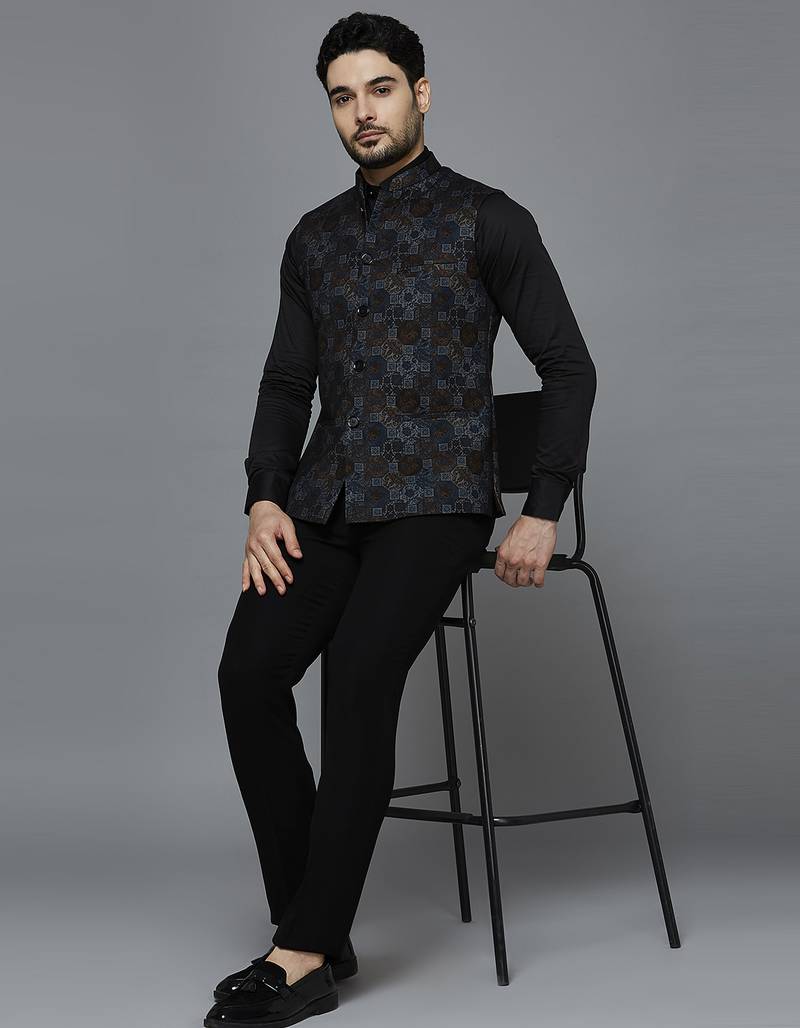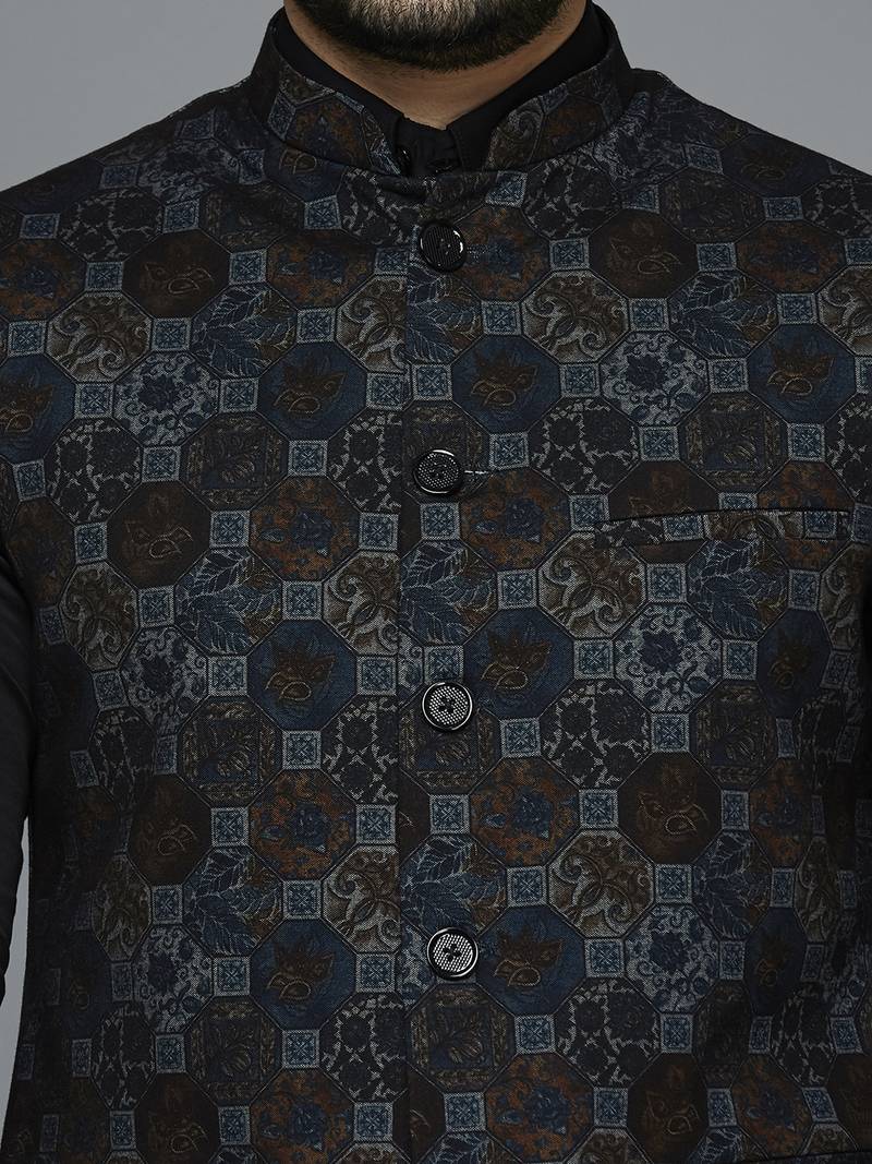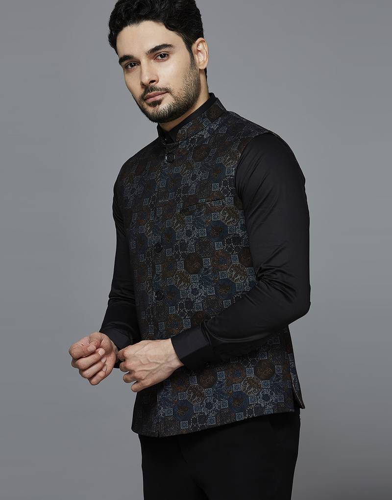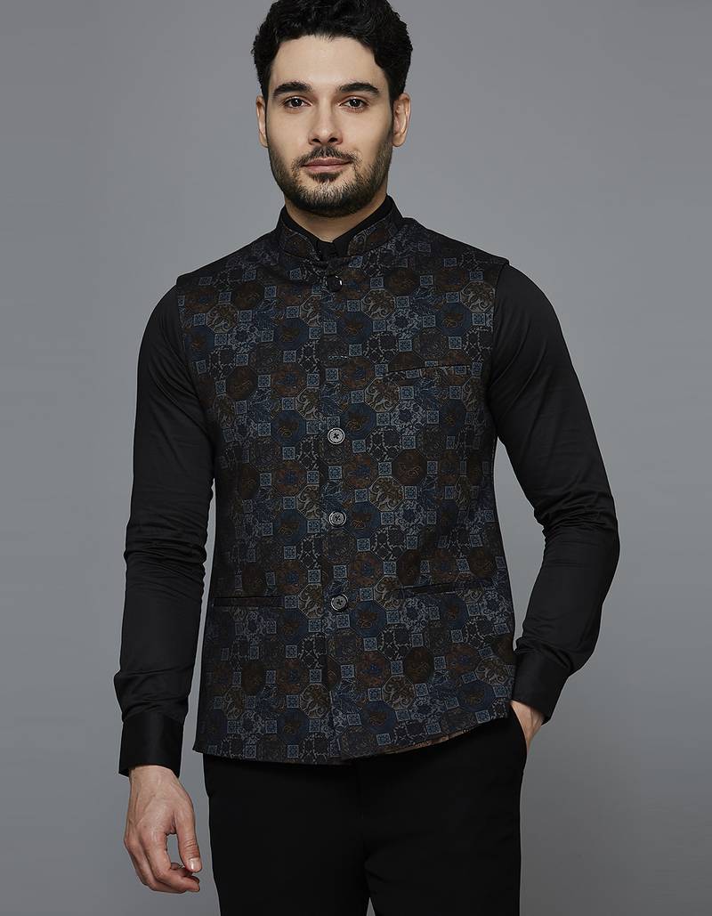 | Product Description | Knitted Blue Block Print Nehru Jacket, Comes With A Mandarin Collar (Bandhgala), Straight Button Placket, And 3 Welt Pockets. |