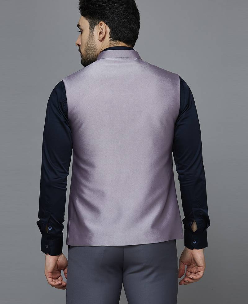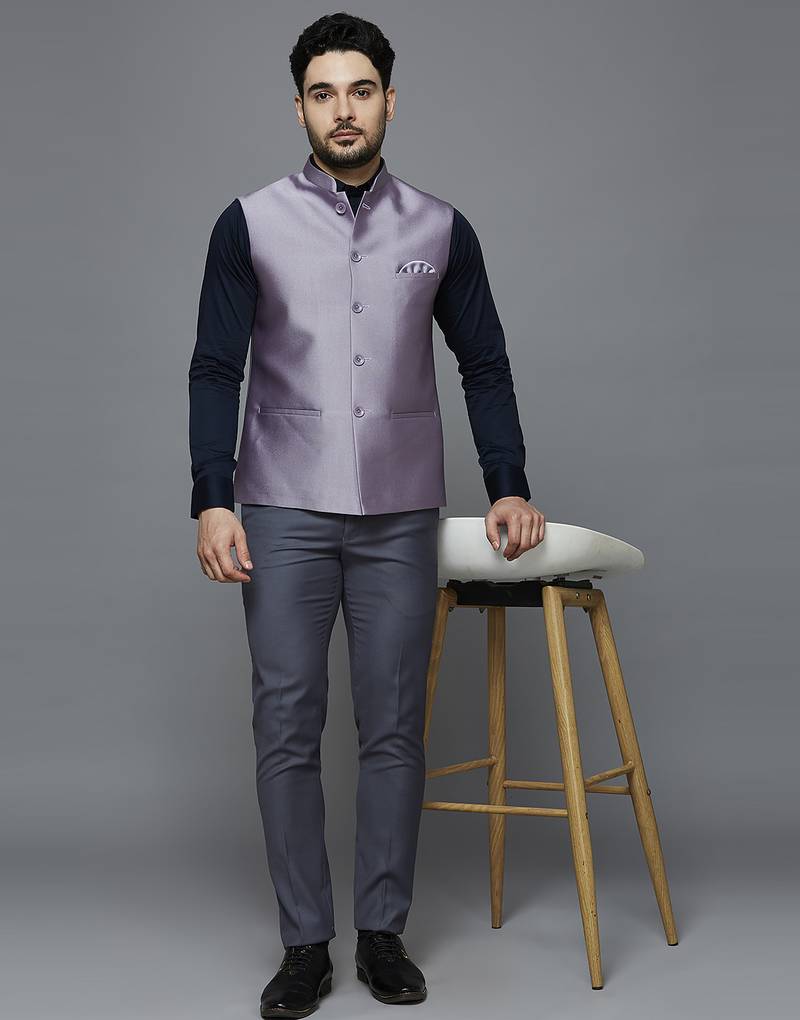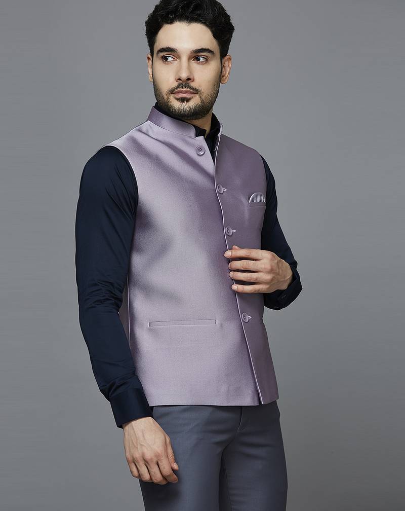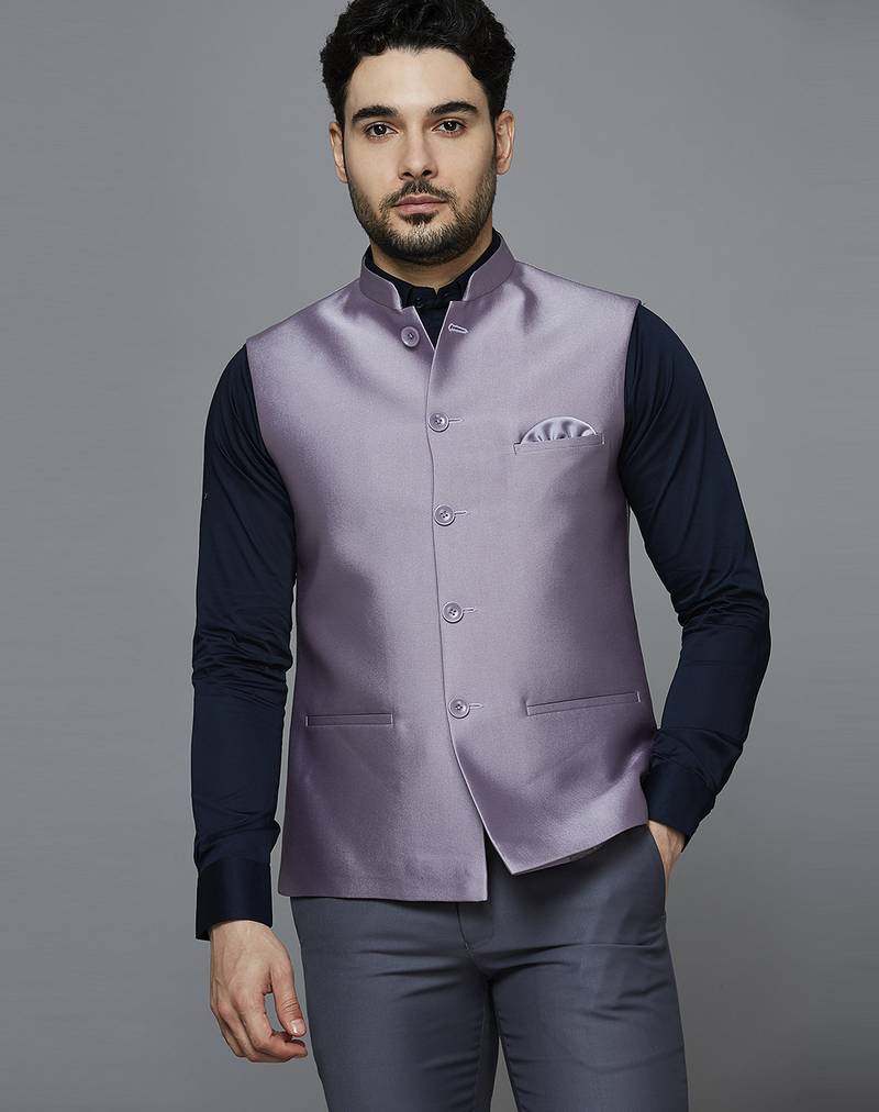 | Product Description | Lavender Solid Nehru Jacket With Self Shine, Comes With A Mandarin Collar (Bandhgala), Straight Button Placket, 3 Welt Pockets And A Pocket Square. |