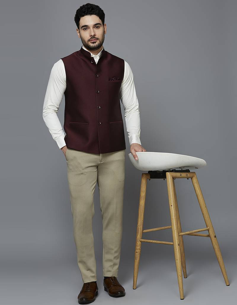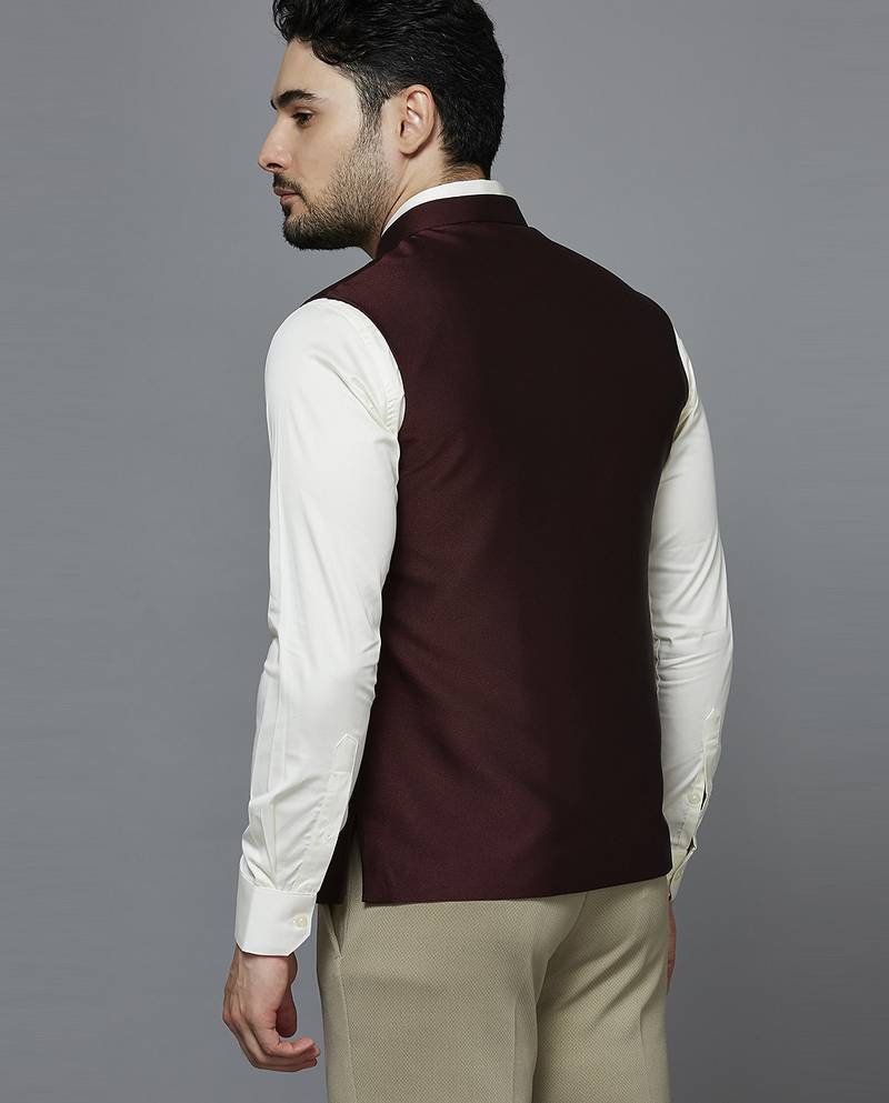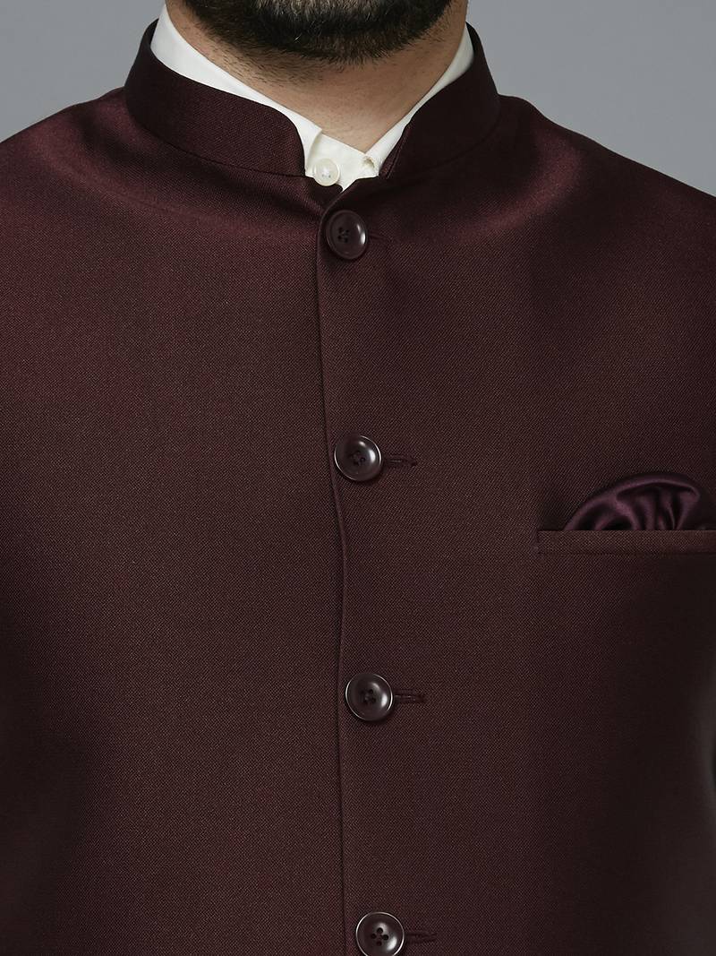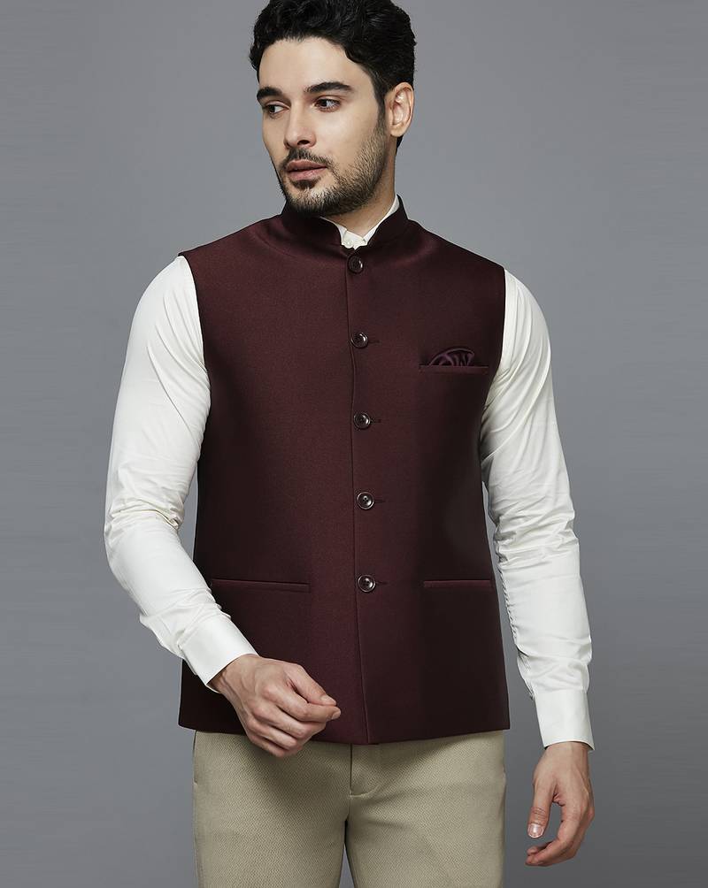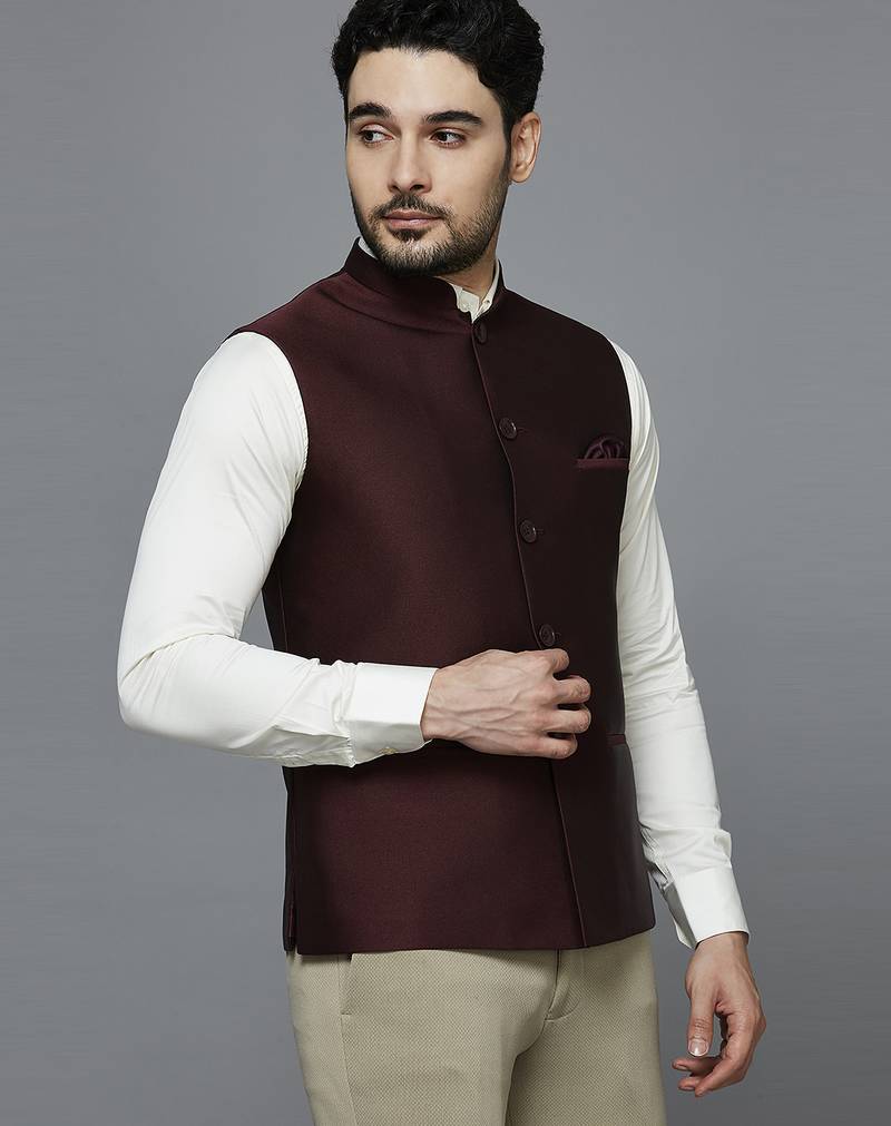 | Product Description | Maroon Solid Nehru Jacket With Self Shine, Comes With A Mandarin Collar (Bandhgala), Straight Button Placket, 3 Welt Pockets And A Pocket Square. |